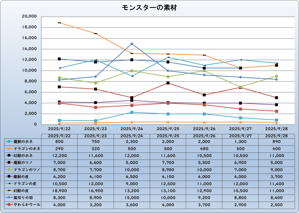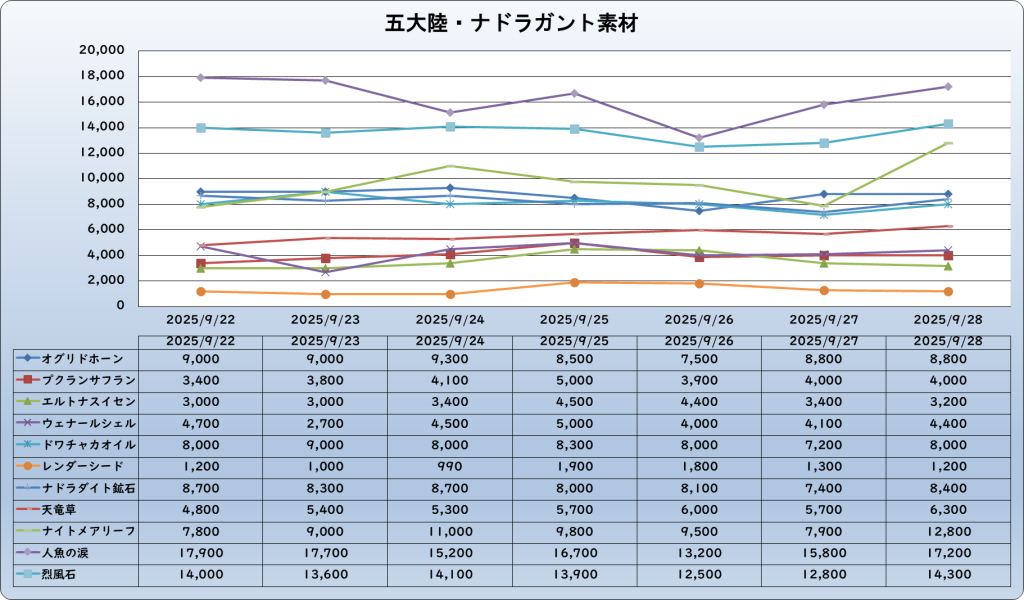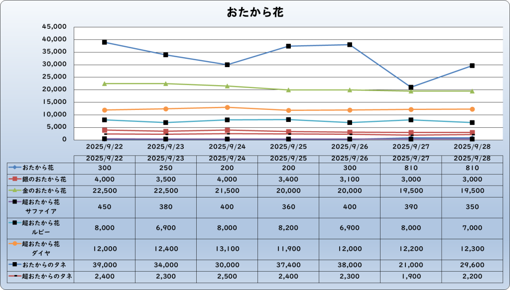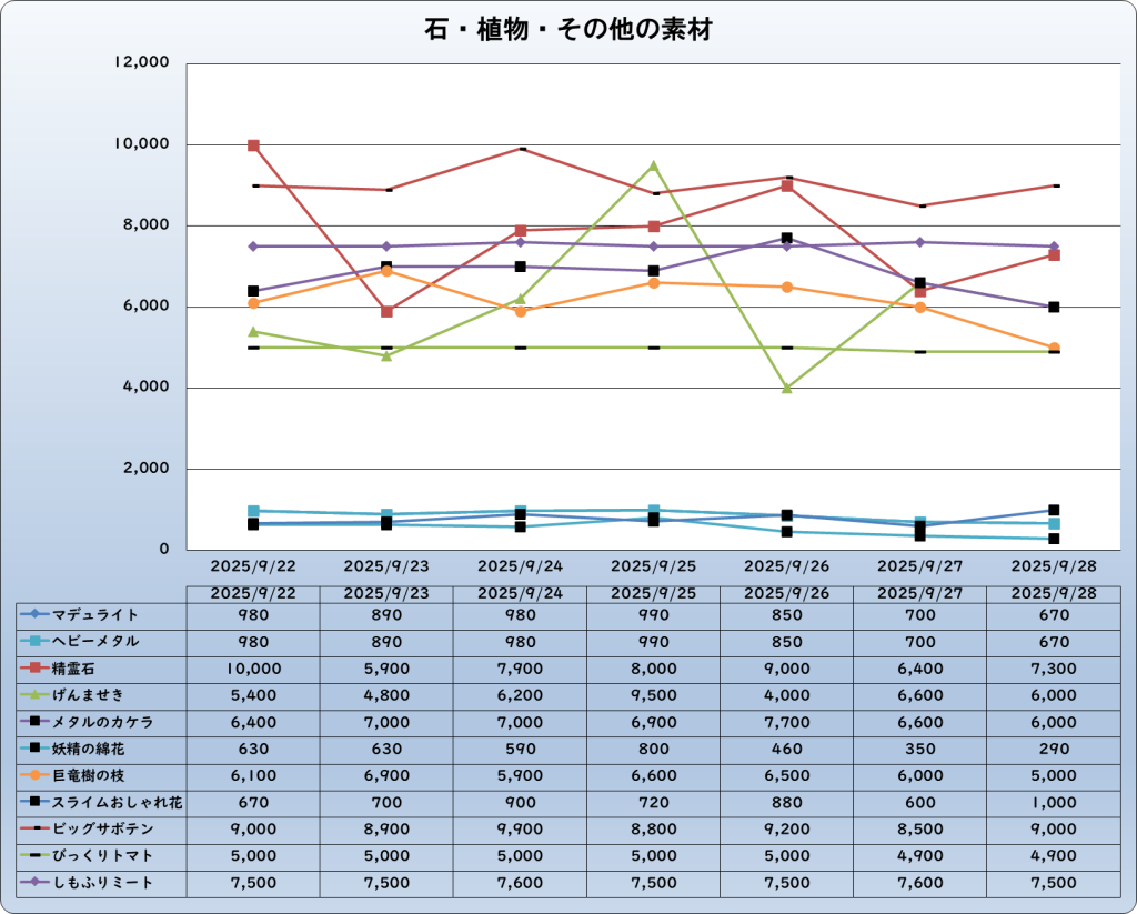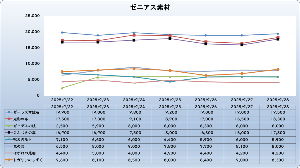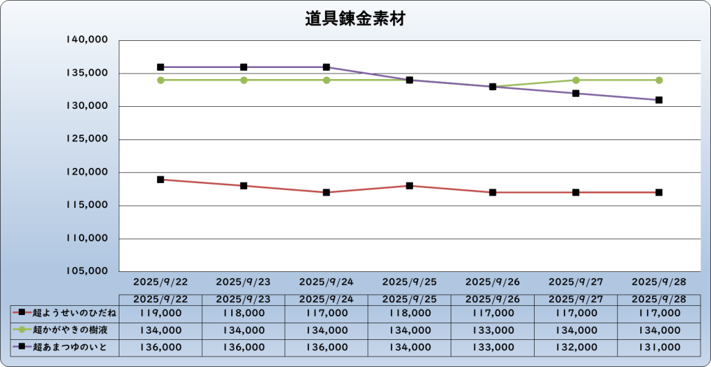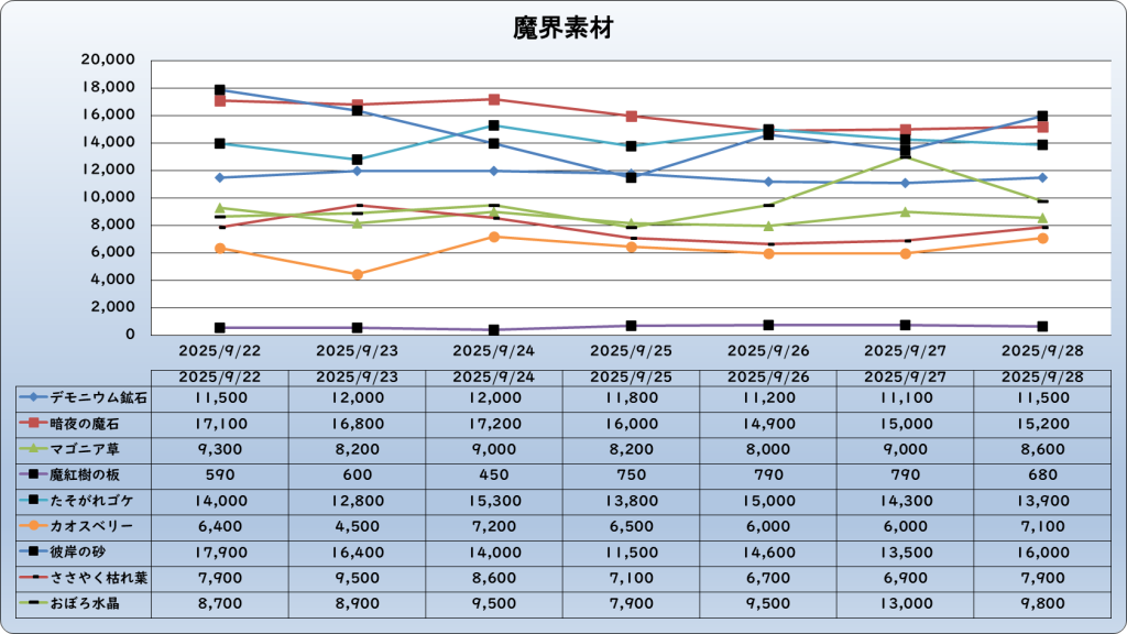 それでは、2025年9月28日までの1週間分のバザー相場の動きを載せています。
