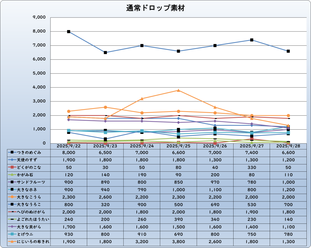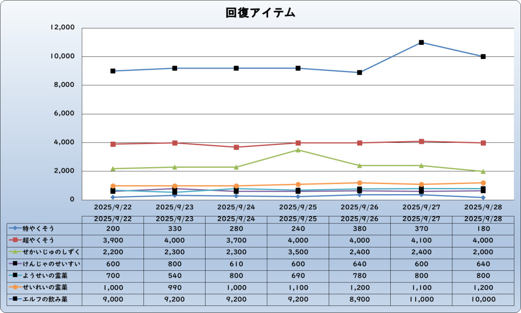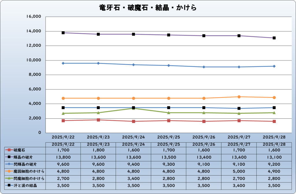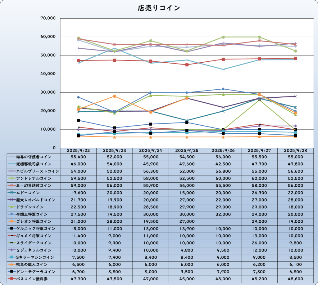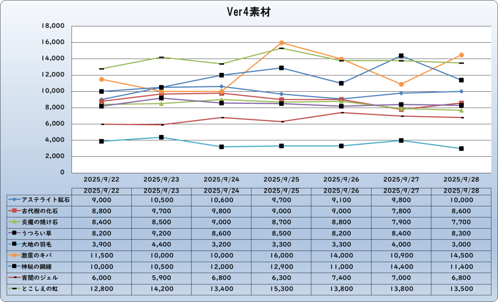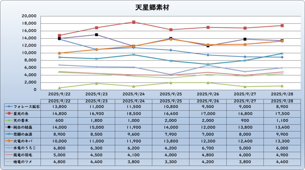 それでは、2025年9月28日までの1週間分のバザー相場の動きを載せています。