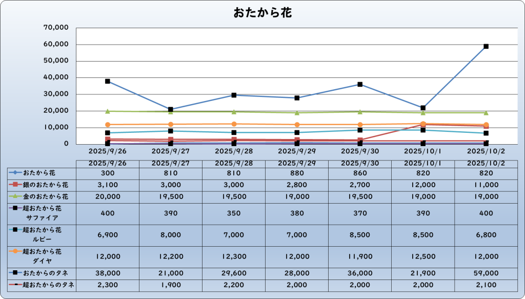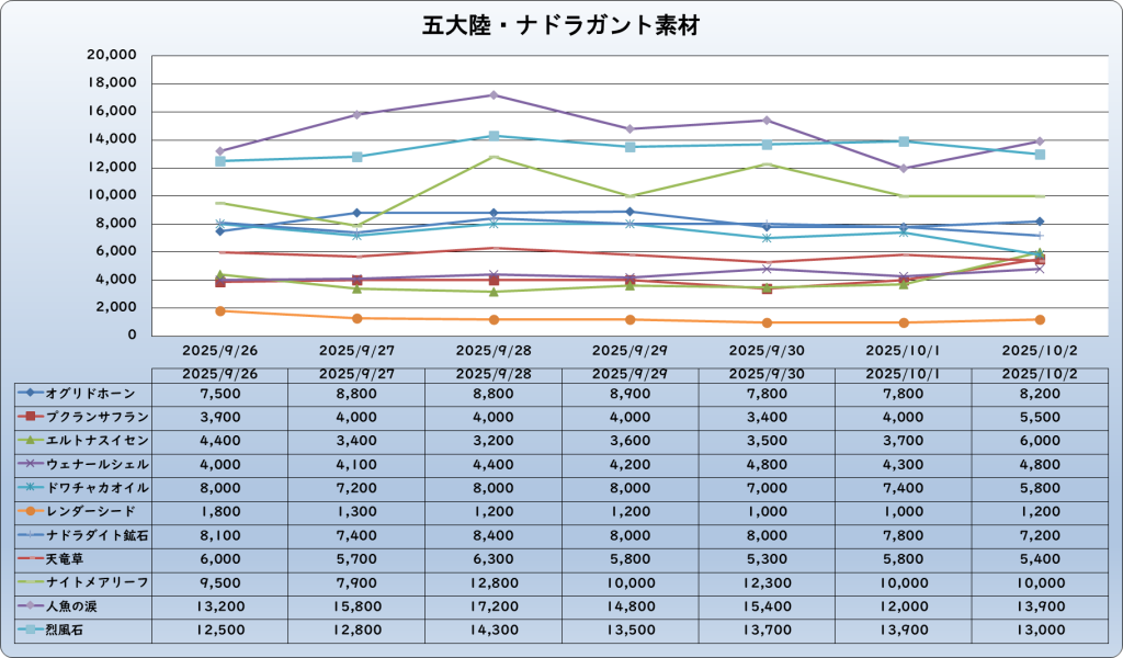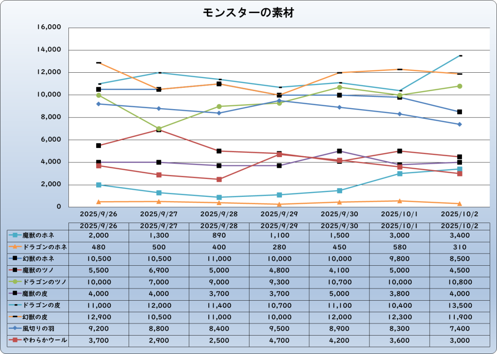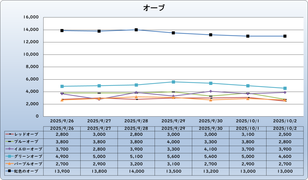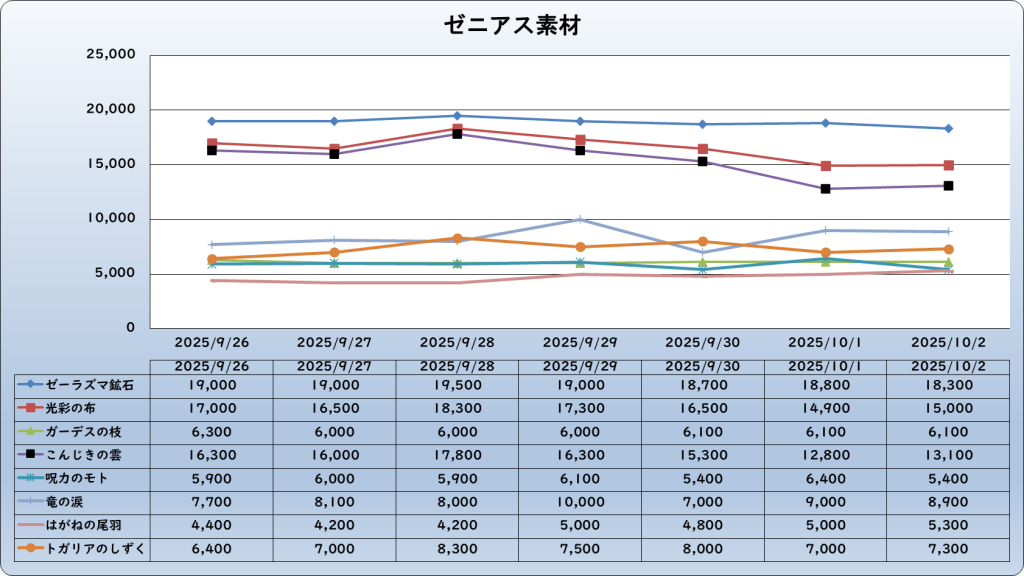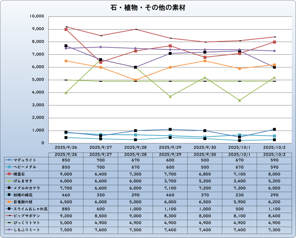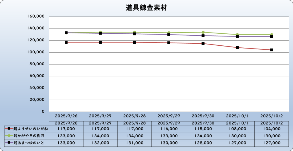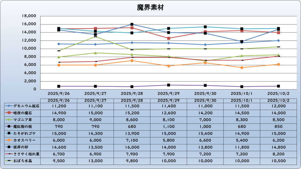 それでは、2025年10月2日までの1週間分のバザー相場の動きを載せています。