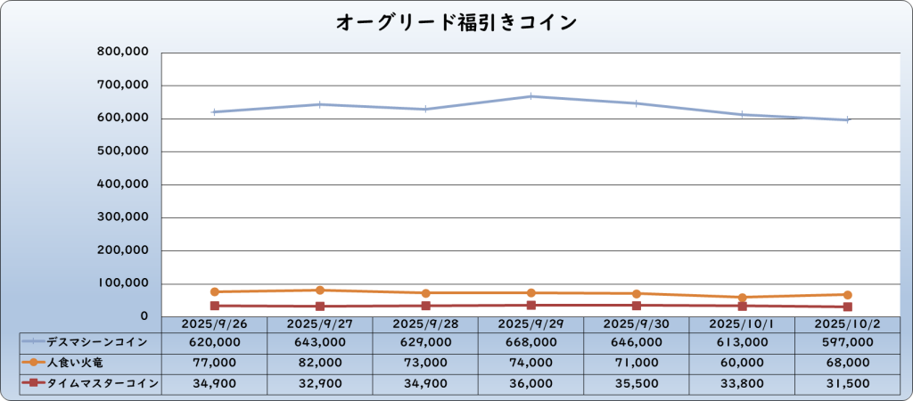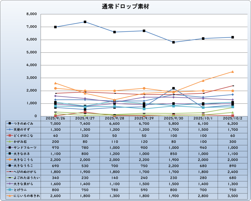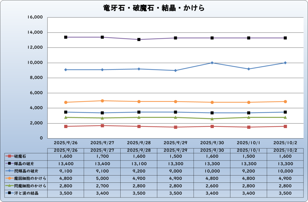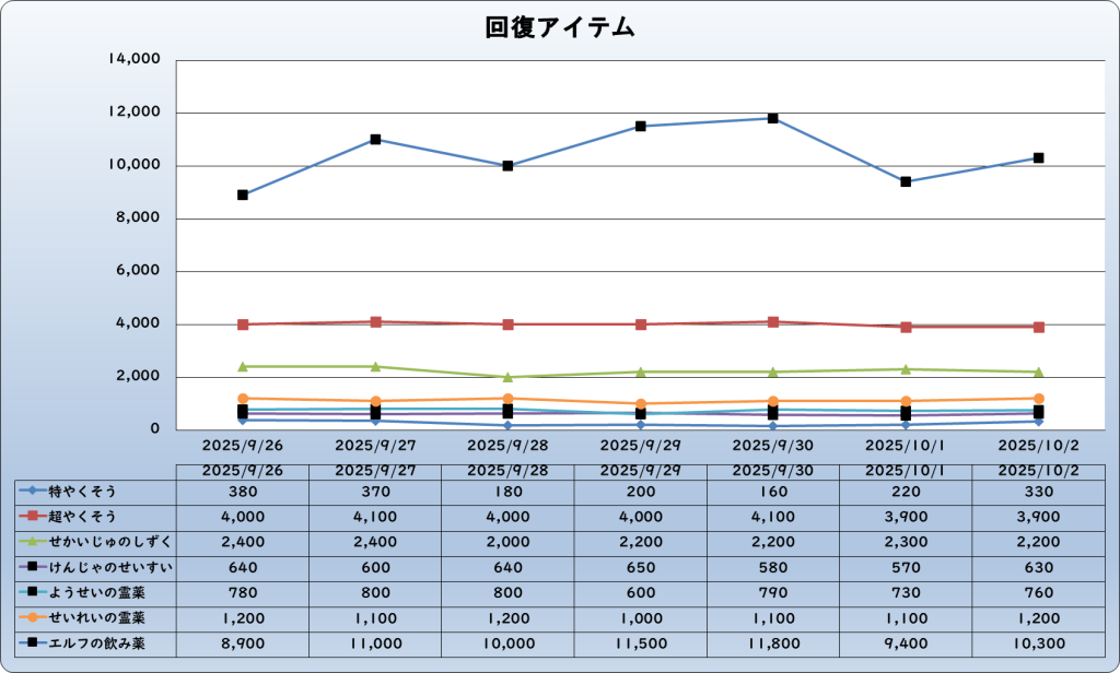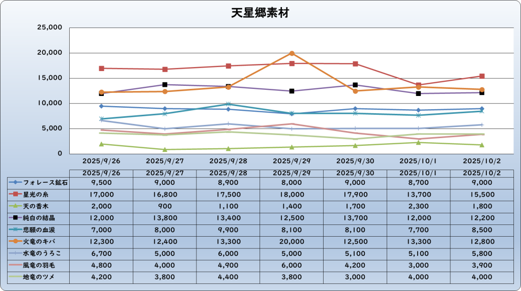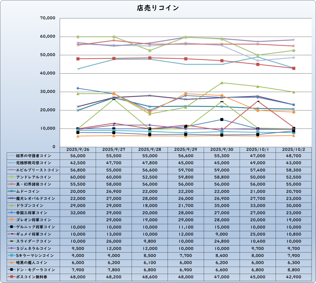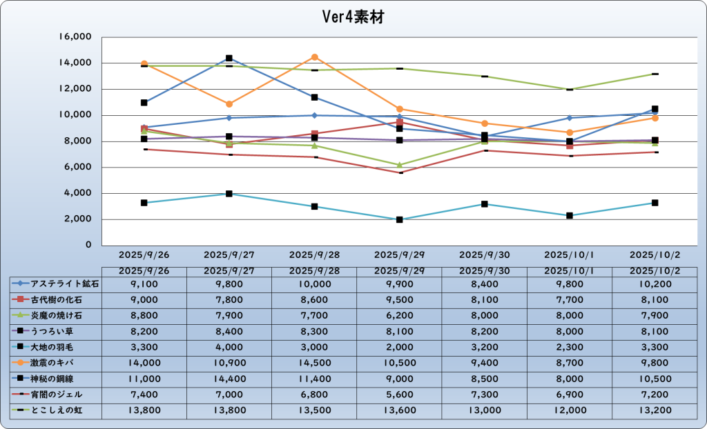 それでは、2025年10月2日までの1週間分のバザー相場の動きを載せています。
