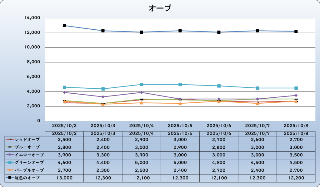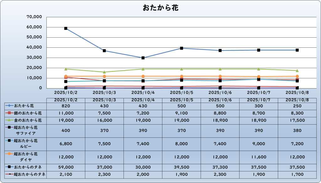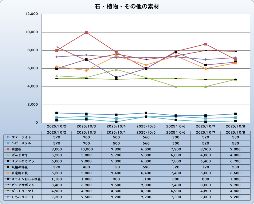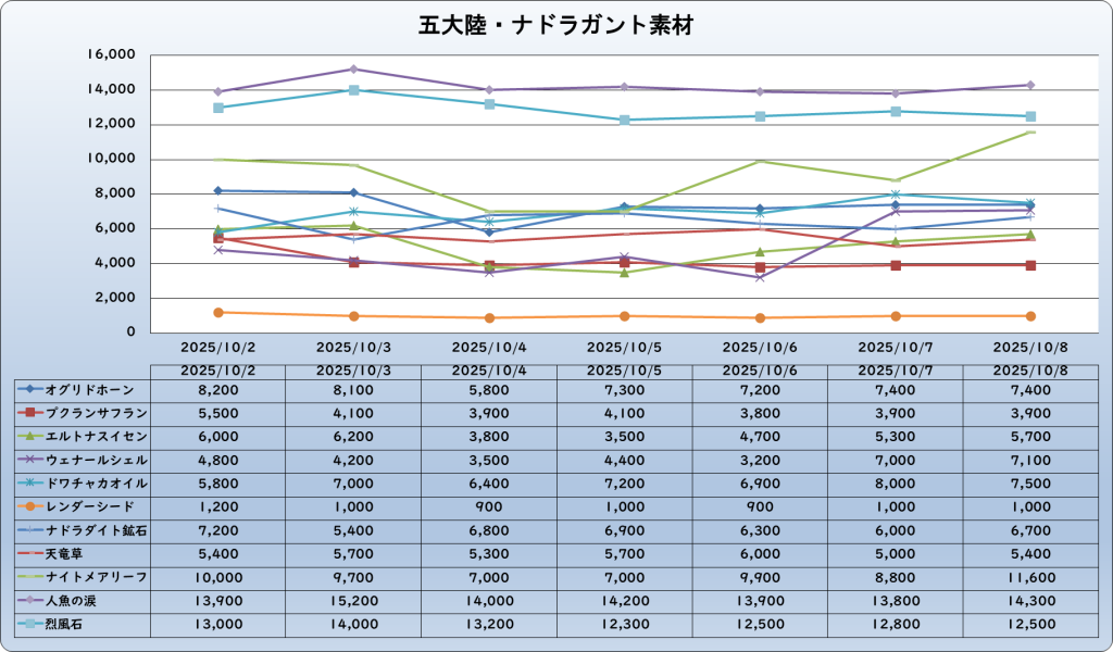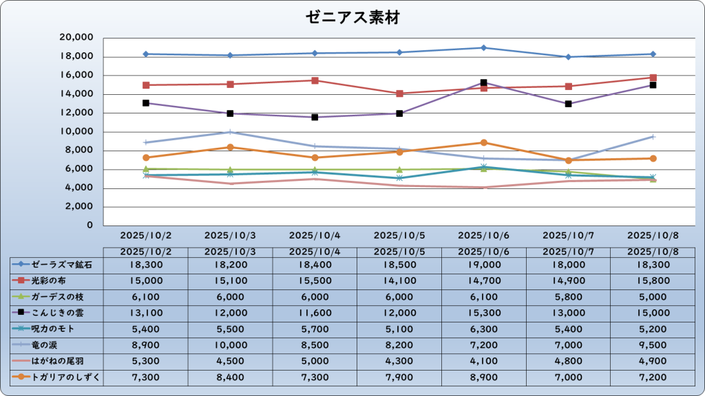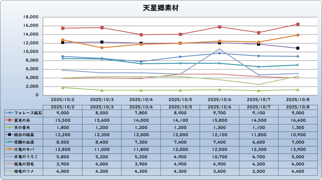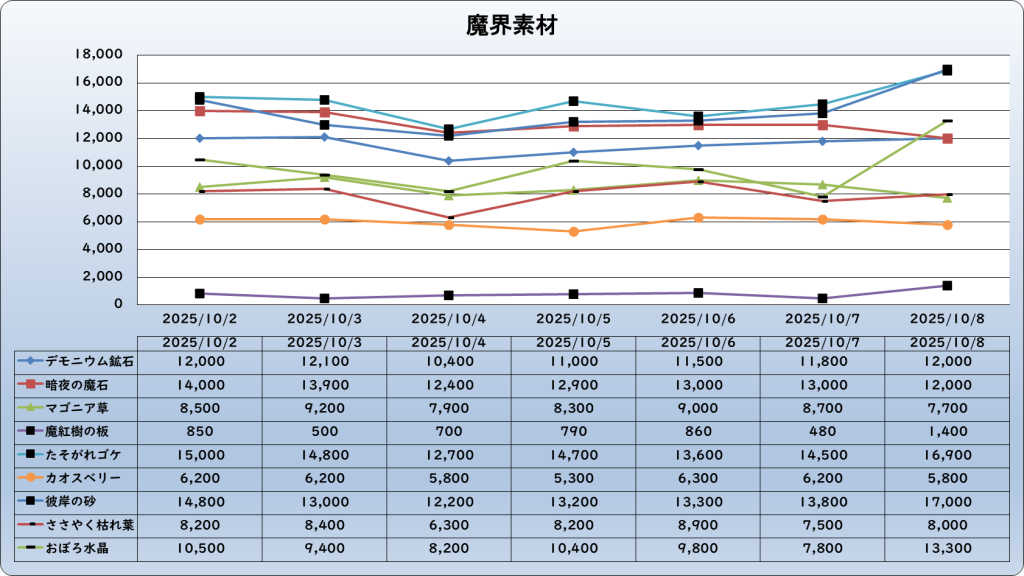 それでは、2025年10月8日までの1週間分のバザー相場の動きを載せています。