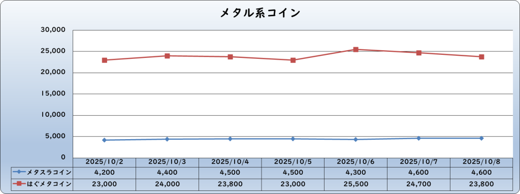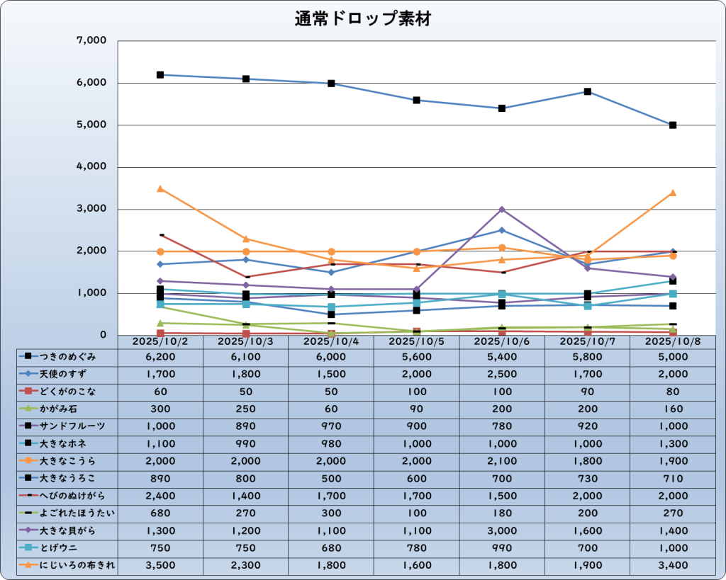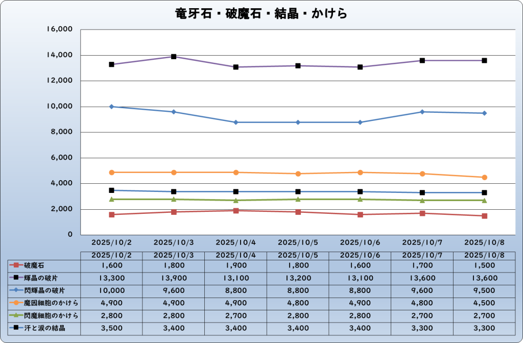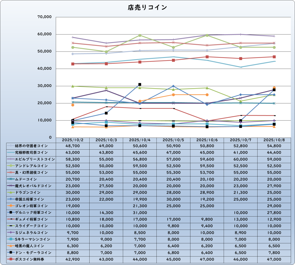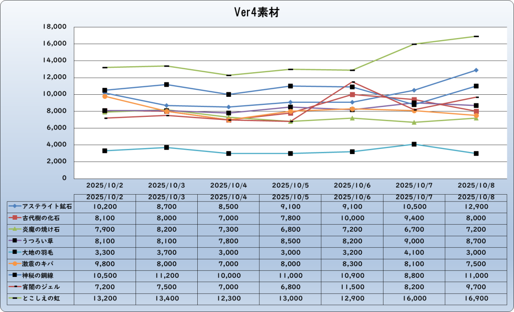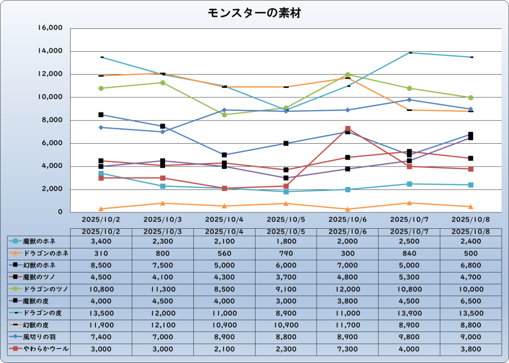 それでは、2025年10月8日までの1週間分のバザー相場の動きを載せています。