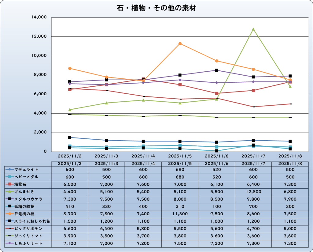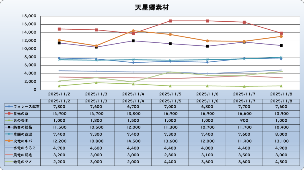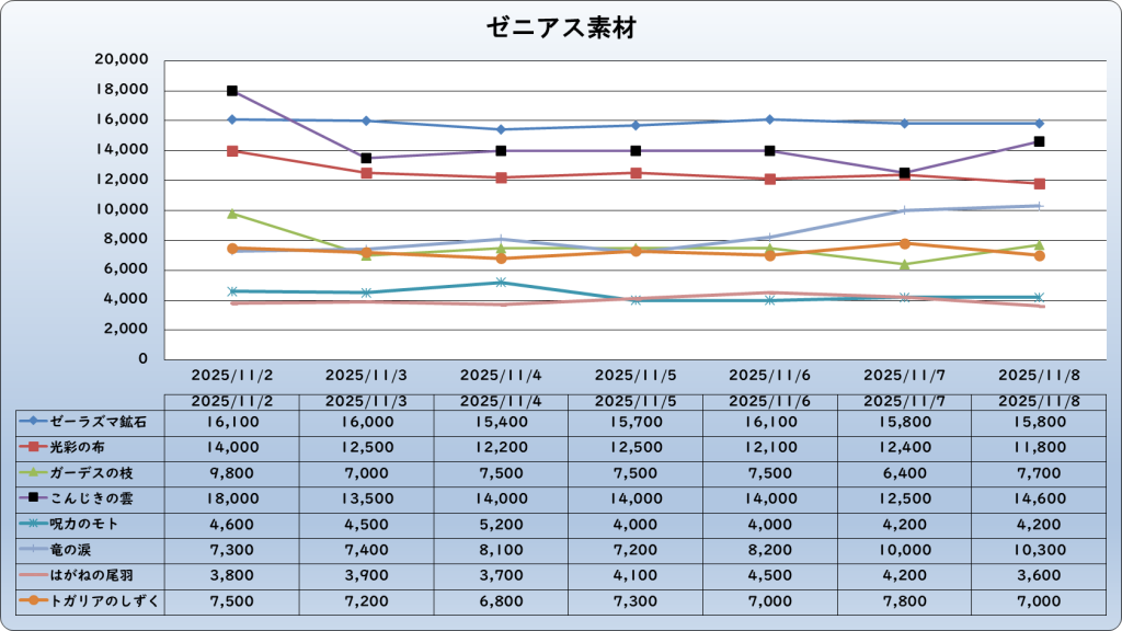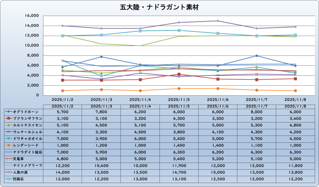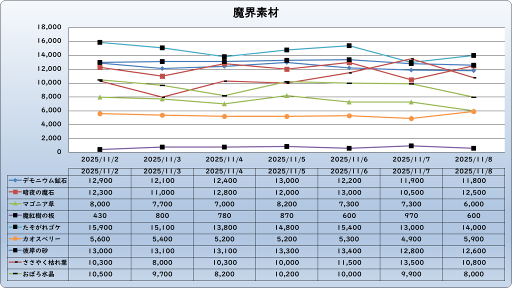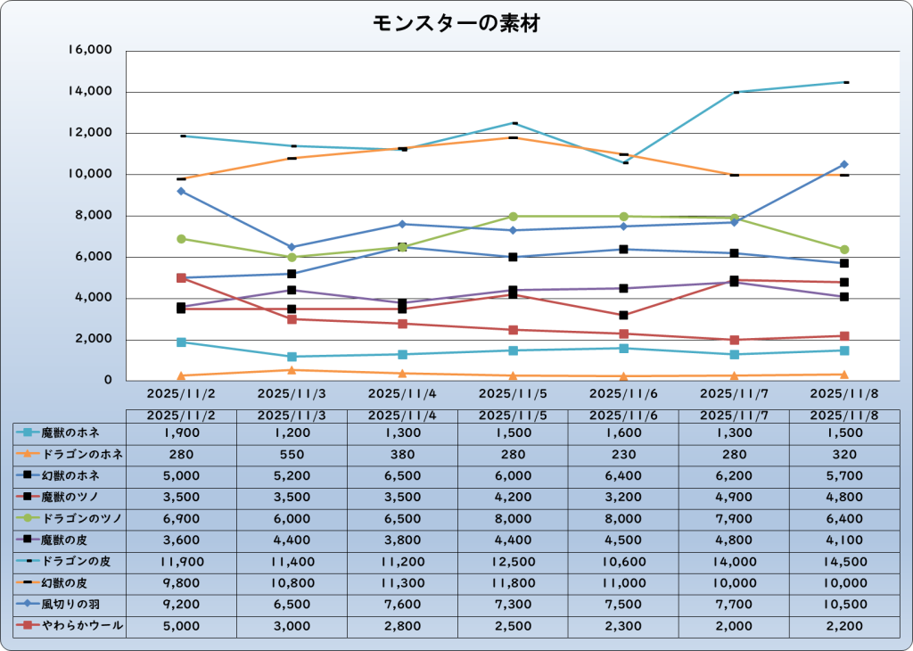 それでは、2025年11月8日までの1週間分のバザー相場の動きを載せています。