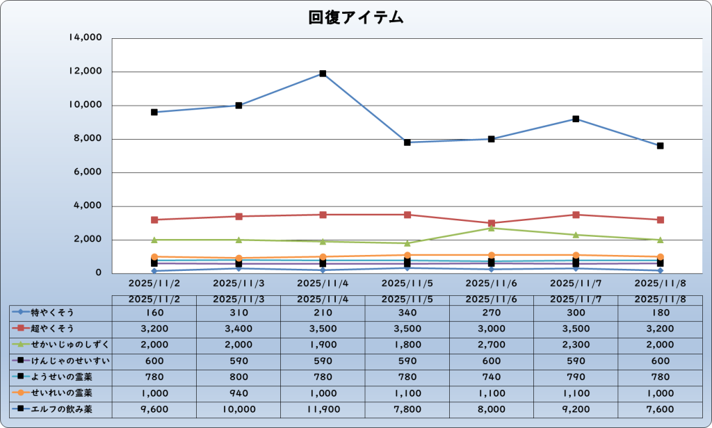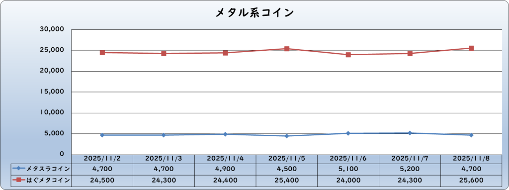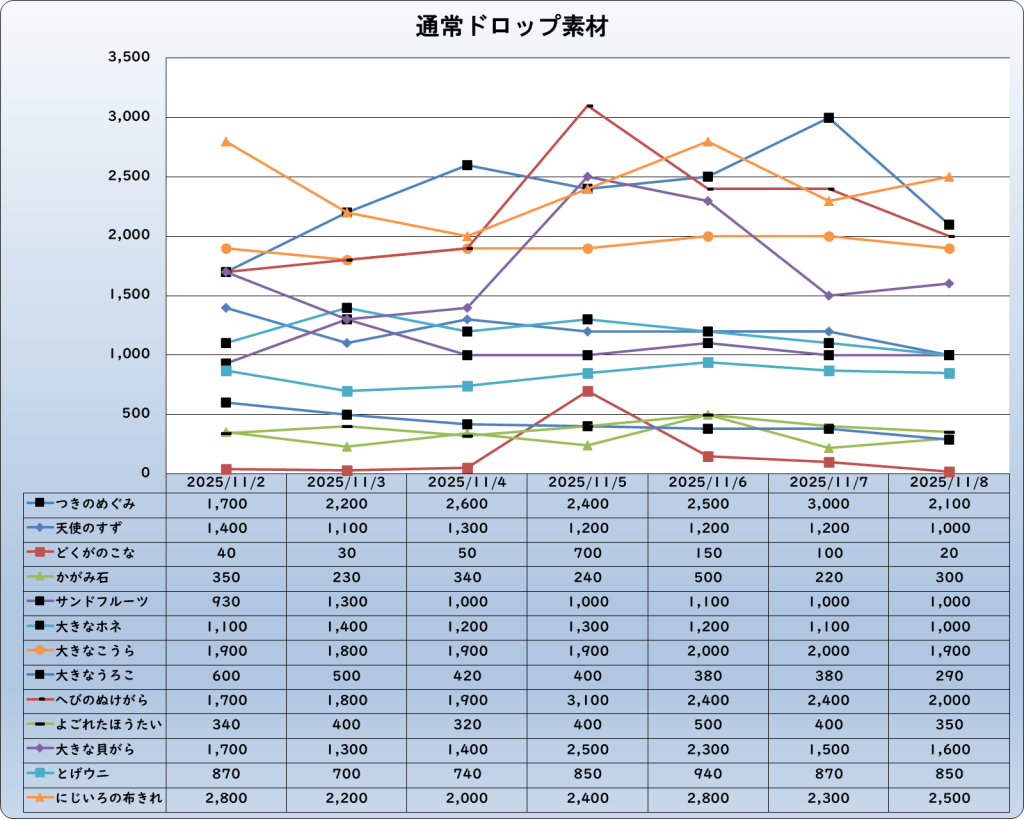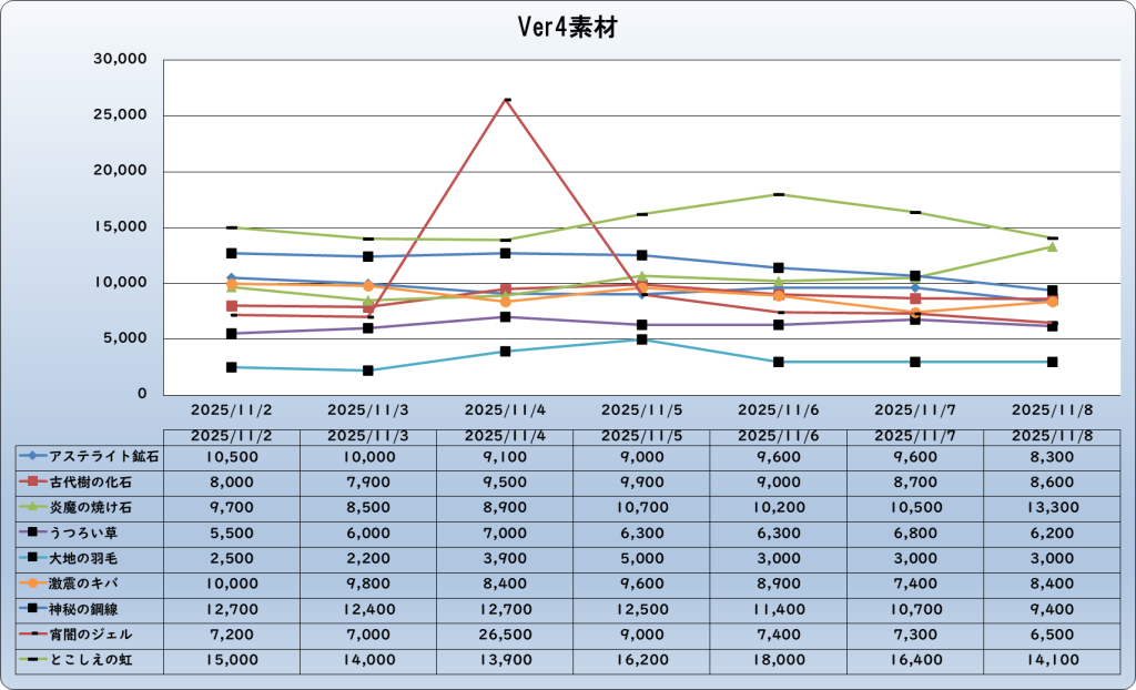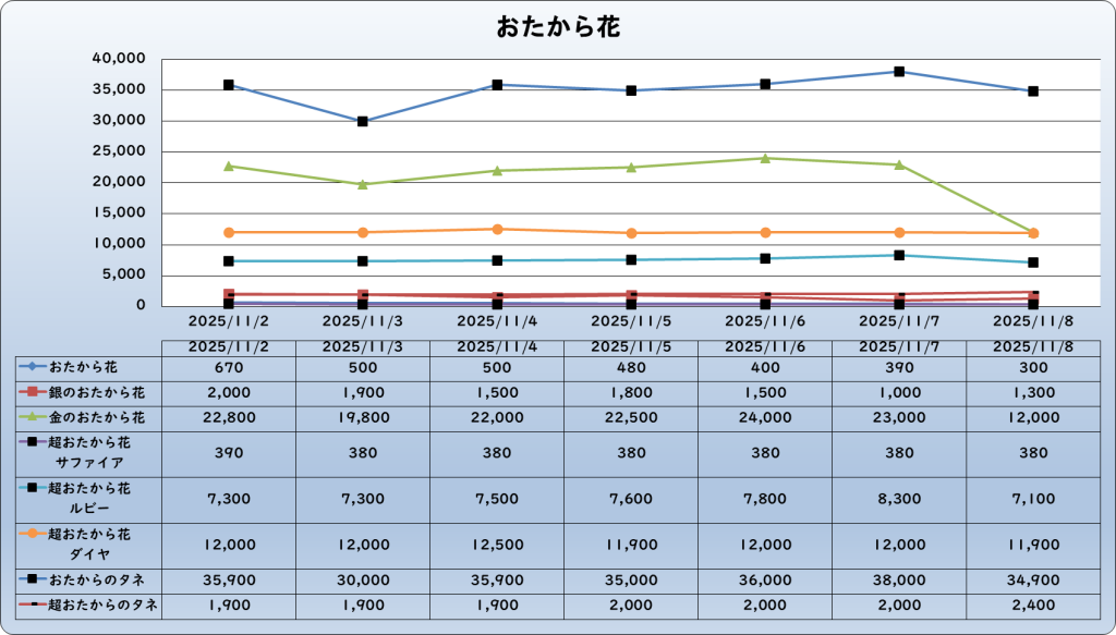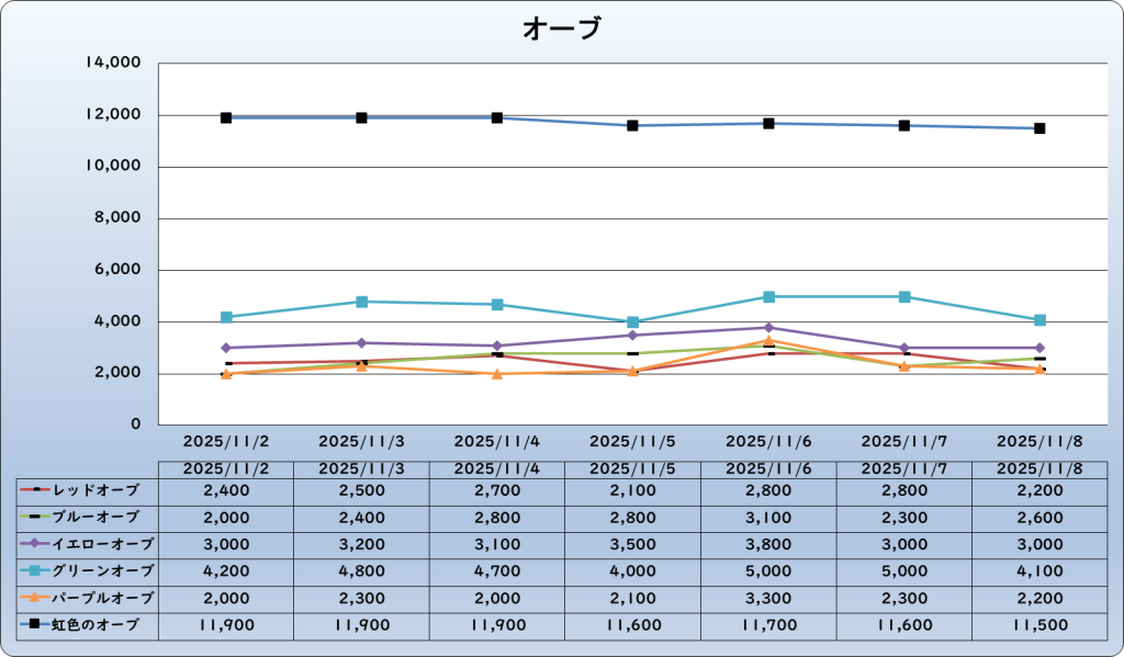 それでは、2025年11月8日までの1週間分のバザー相場の動きを載せています。