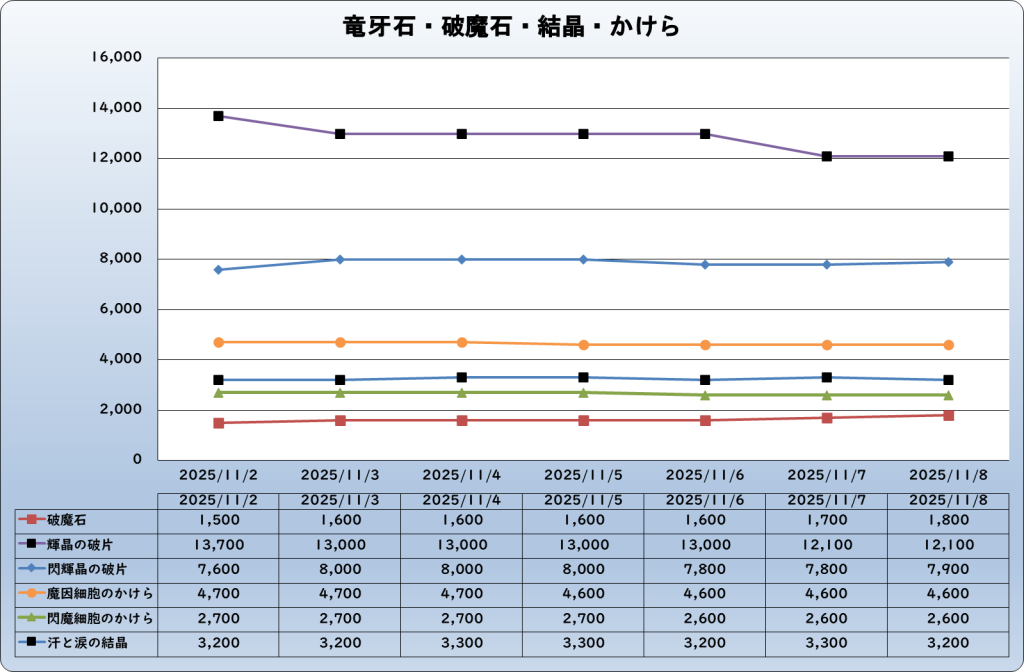 | 閃輝晶の破片 | 7,900 | -100 | -1.3% | 8,000 |