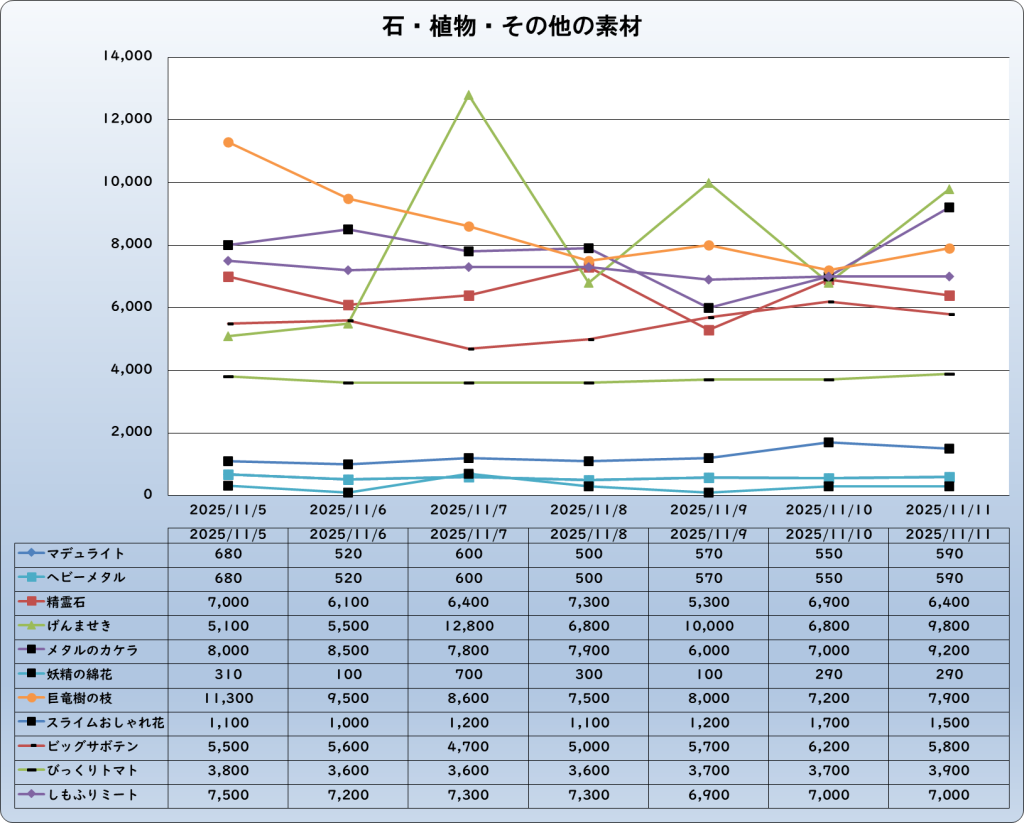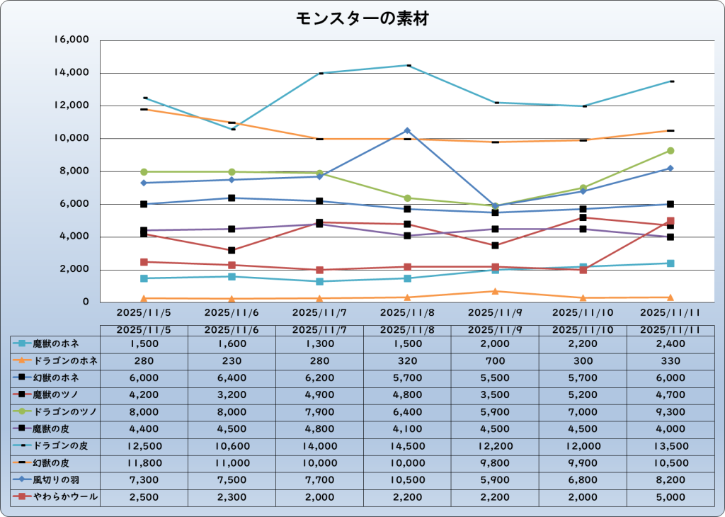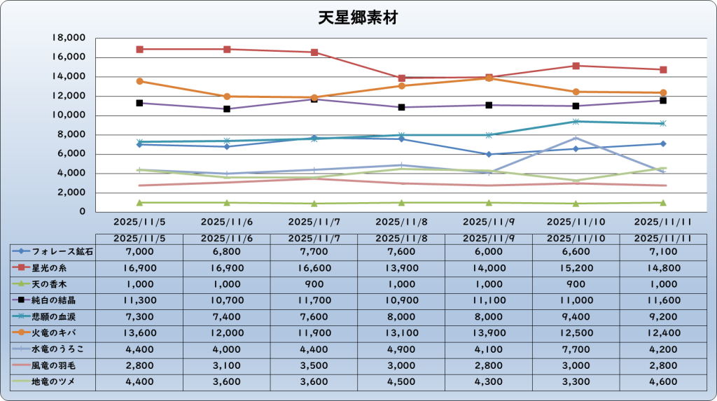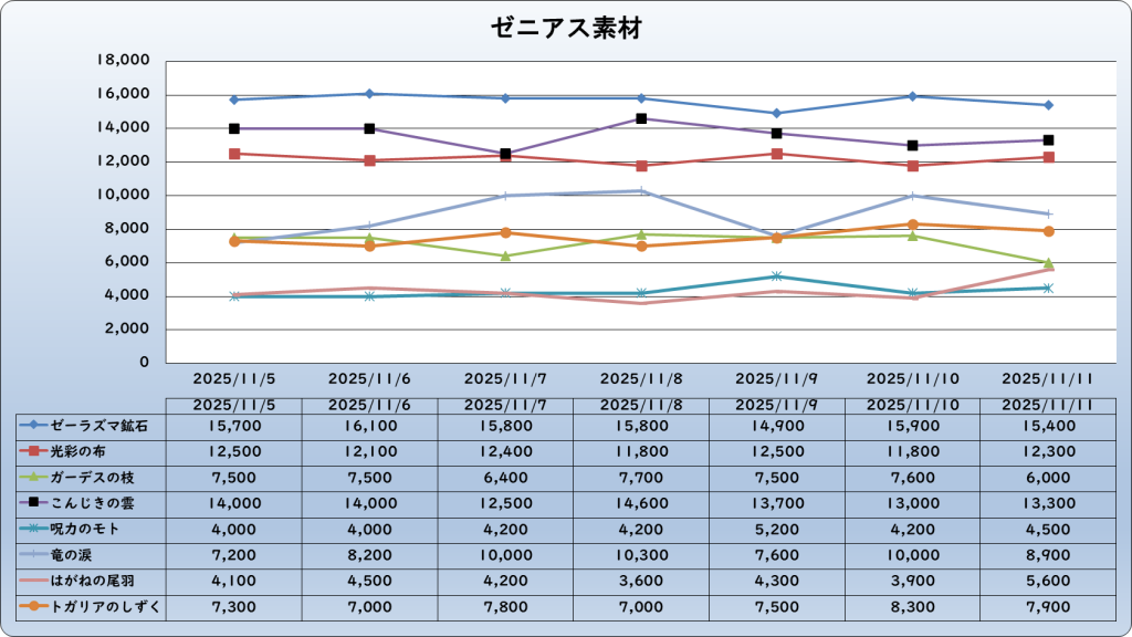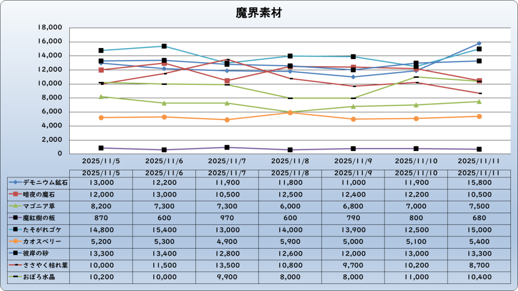 それでは、2025年11月8日までの1週間分のバザー相場の動きを載せています。