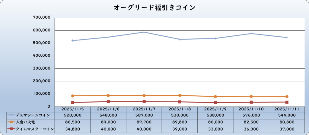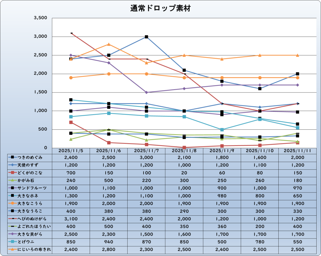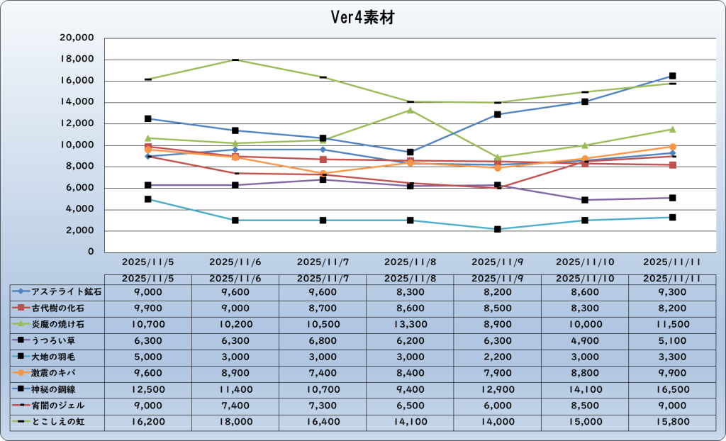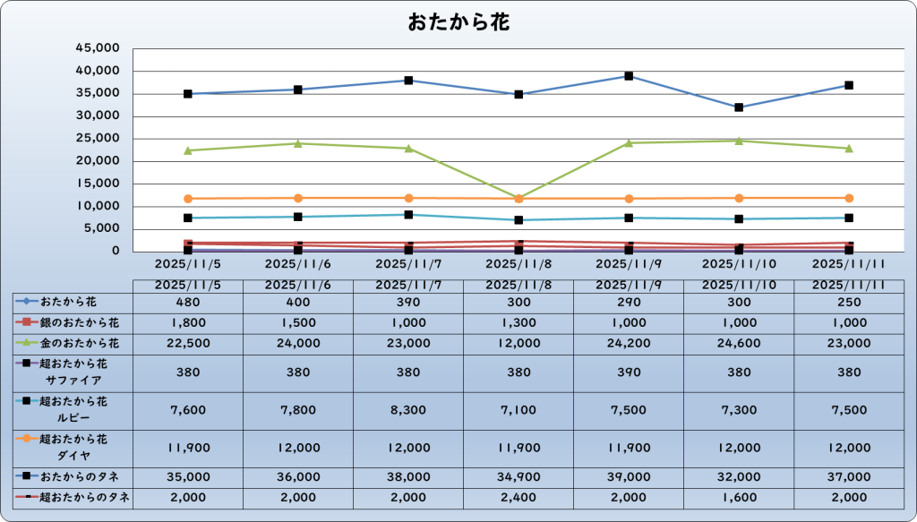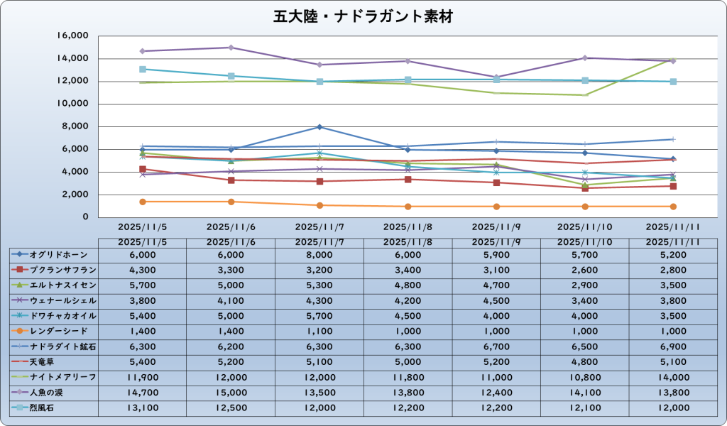 それでは、2025年11月8日までの1週間分のバザー相場の動きを載せています。