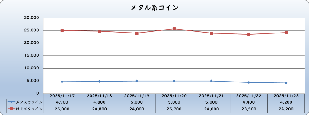 | はぐメタコイン | 24,200 | -1,300 | -5.1% | 25,500 |
