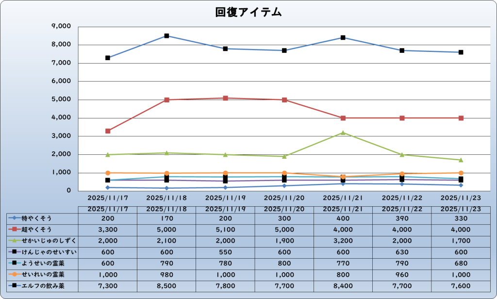 | せいれいの霊薬 | 1,000 | -100 | -9.1% | 1,100 |