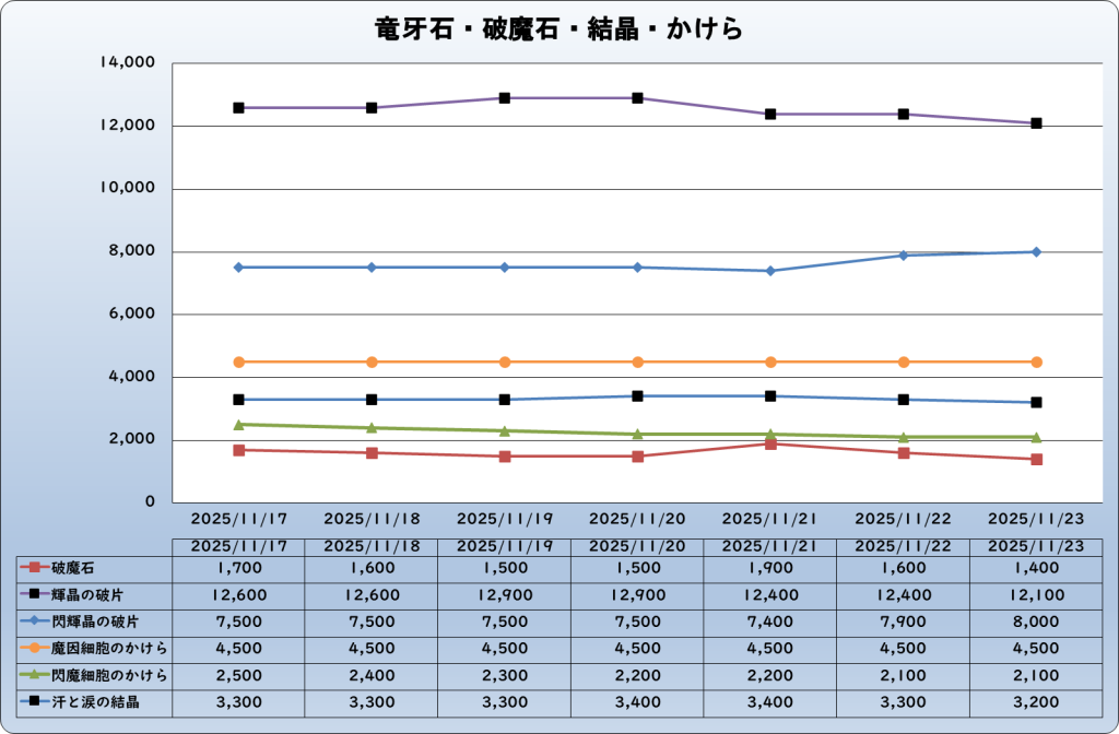 | 輝晶の破片 | 12,100 | -500 | -4.0% | 12,600 |