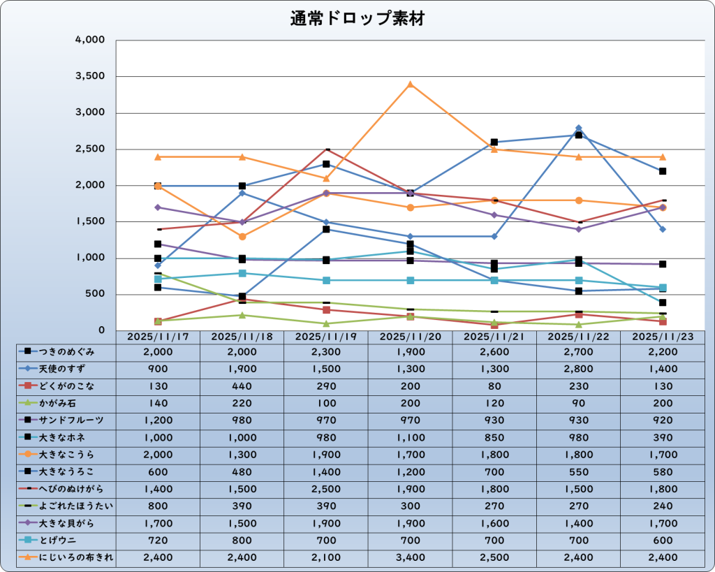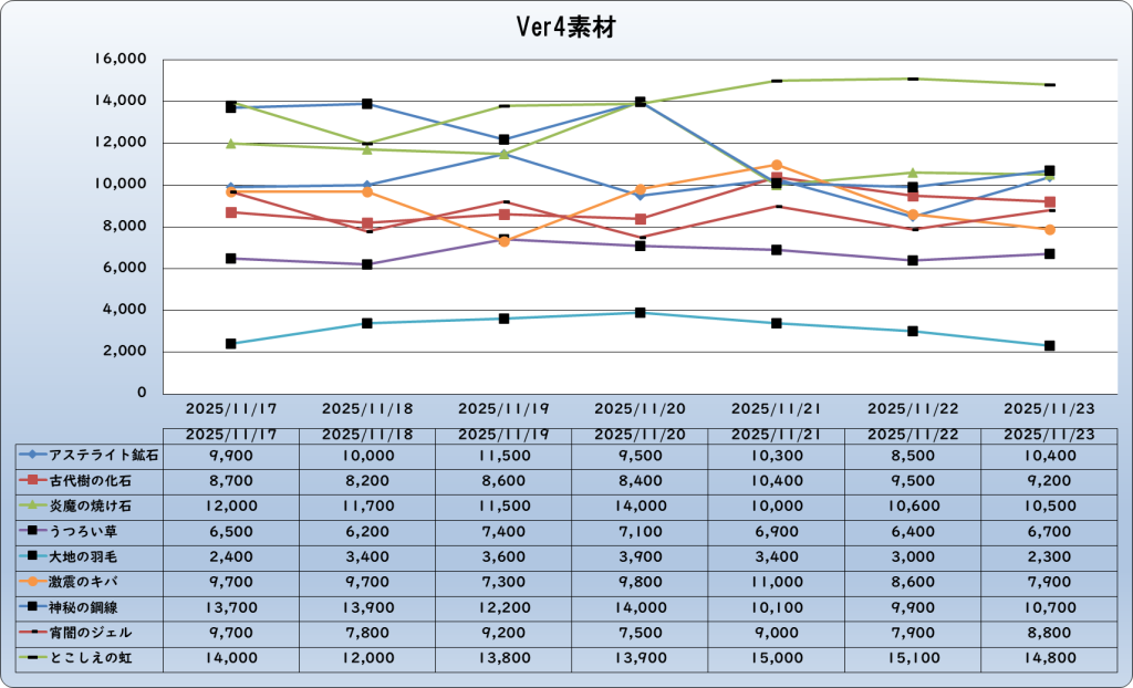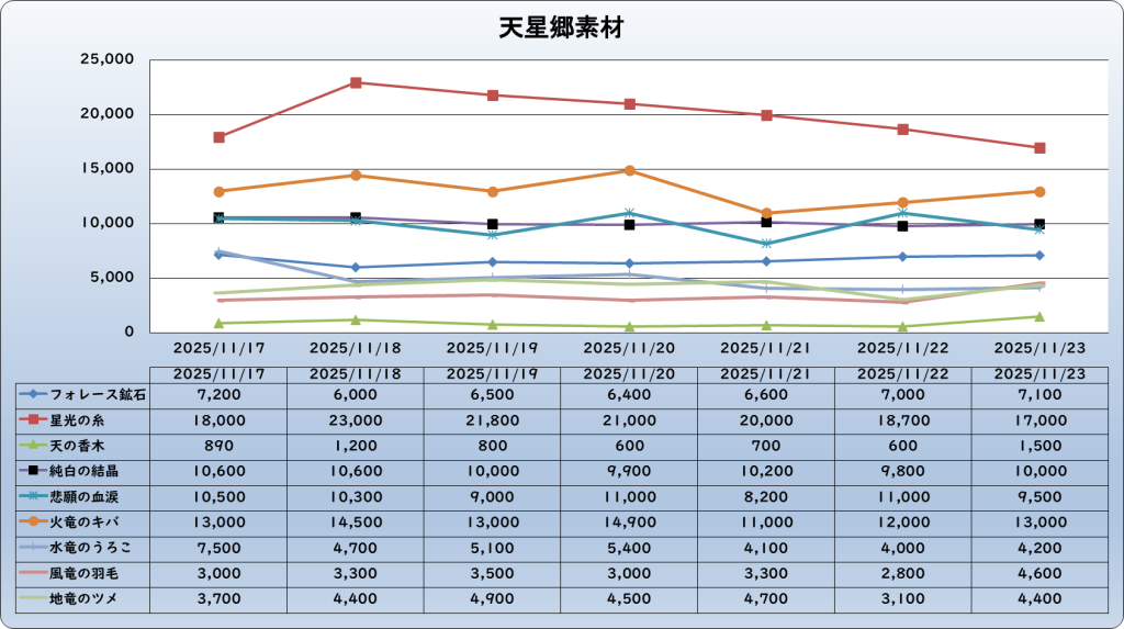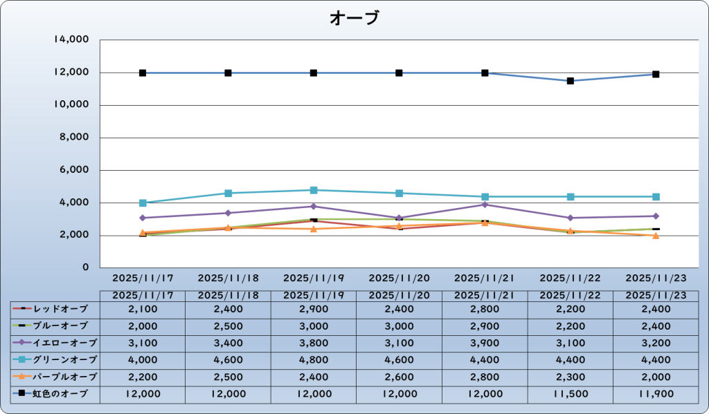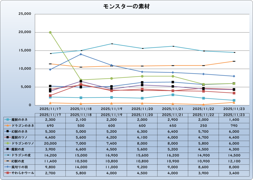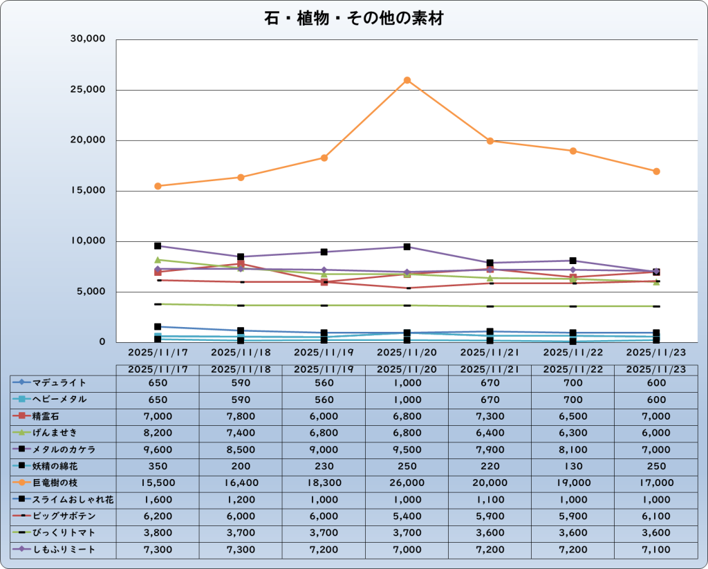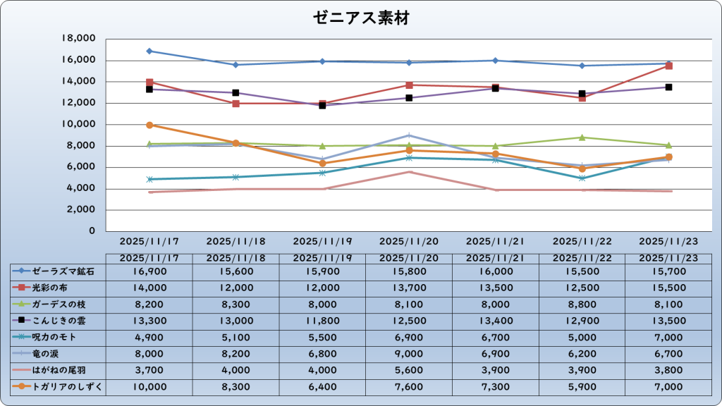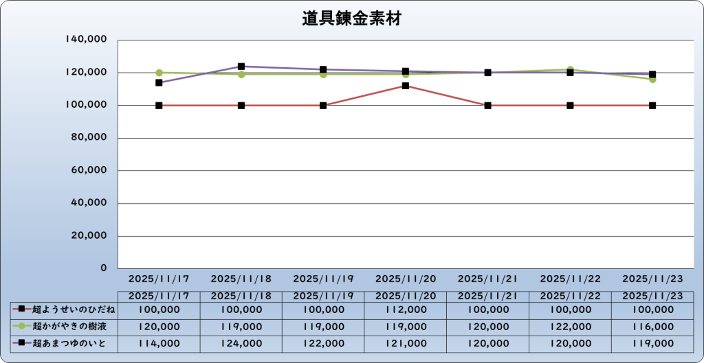 それでは、2025年11月23日までの1週間分のバザー相場の動きを載せています。