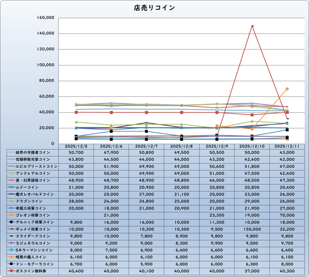 | 究極邪教司祭コイン | 42,000 | -2,100 | -4.8% | 44,100 |