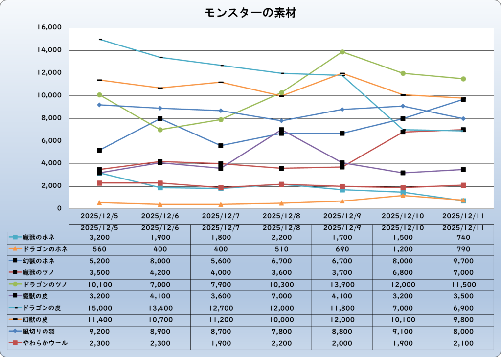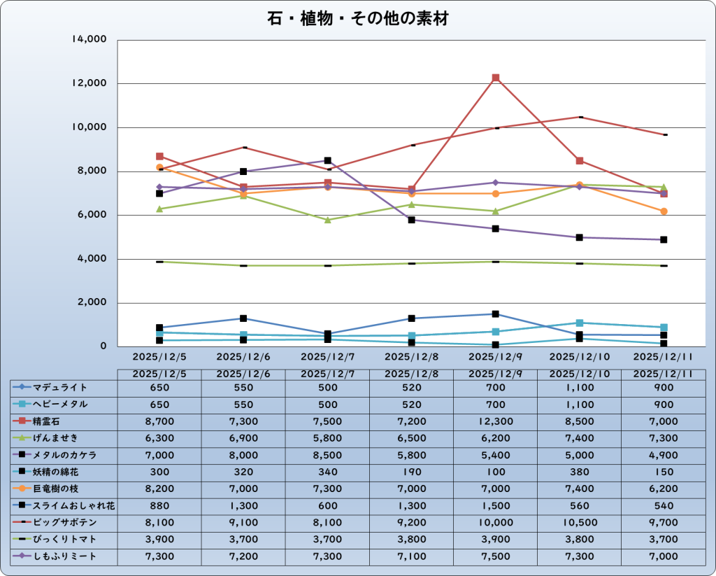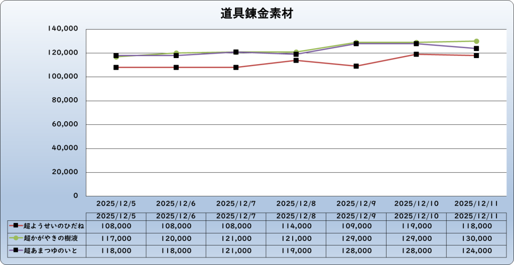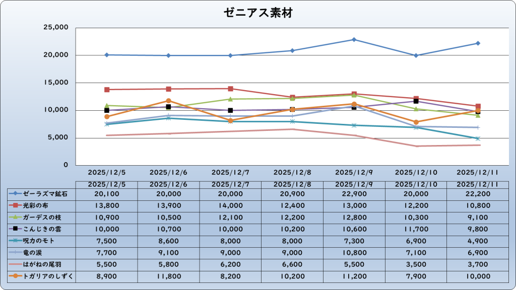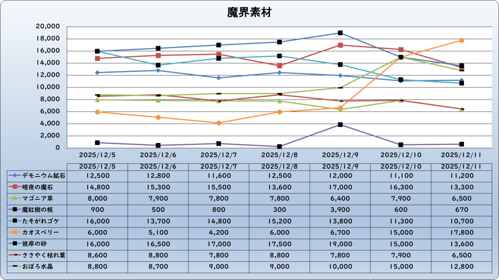 それでは、2025年12月11日までの1週間分のバザー相場の動きを載せています。