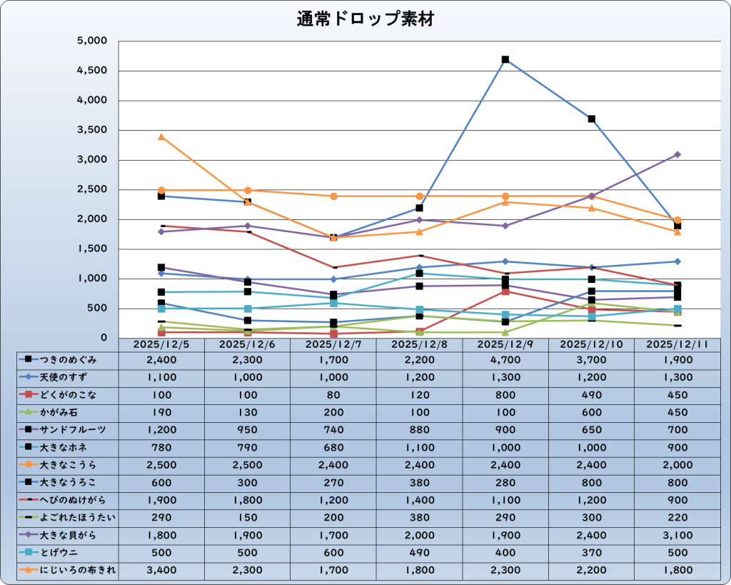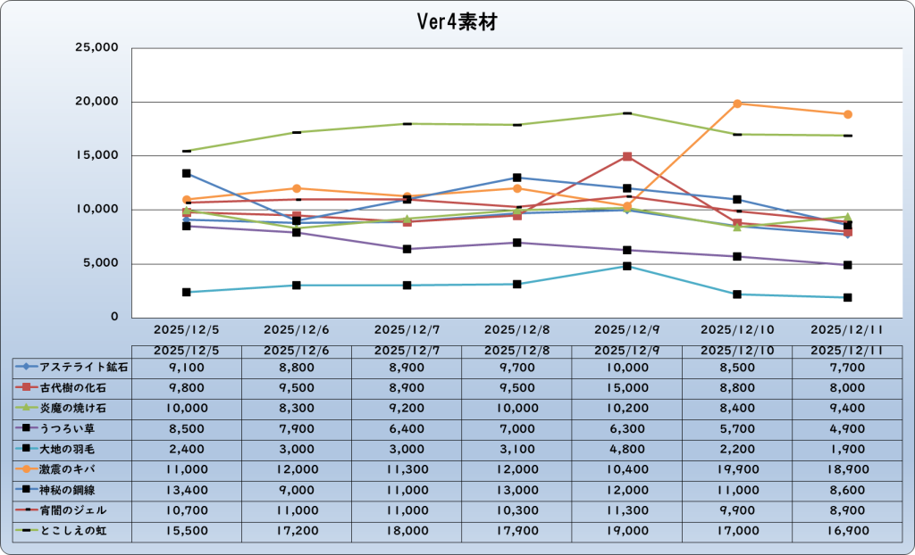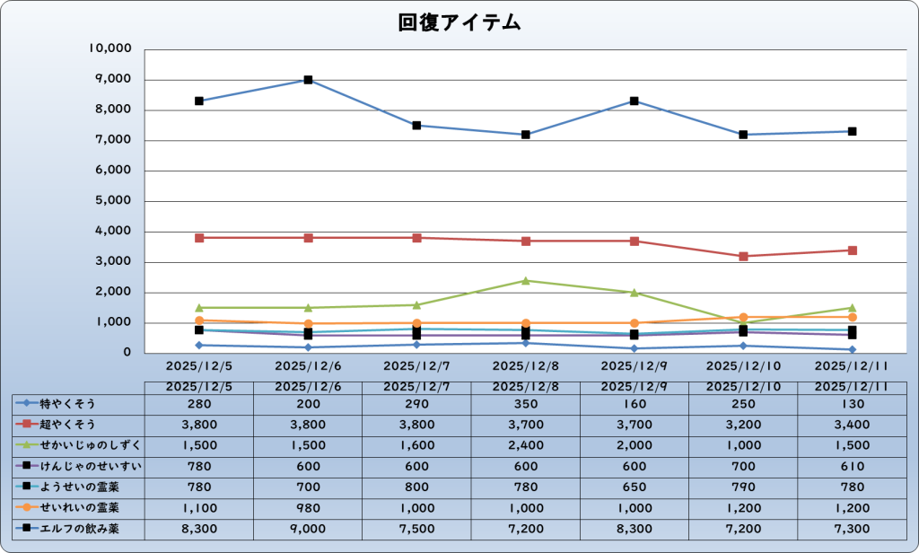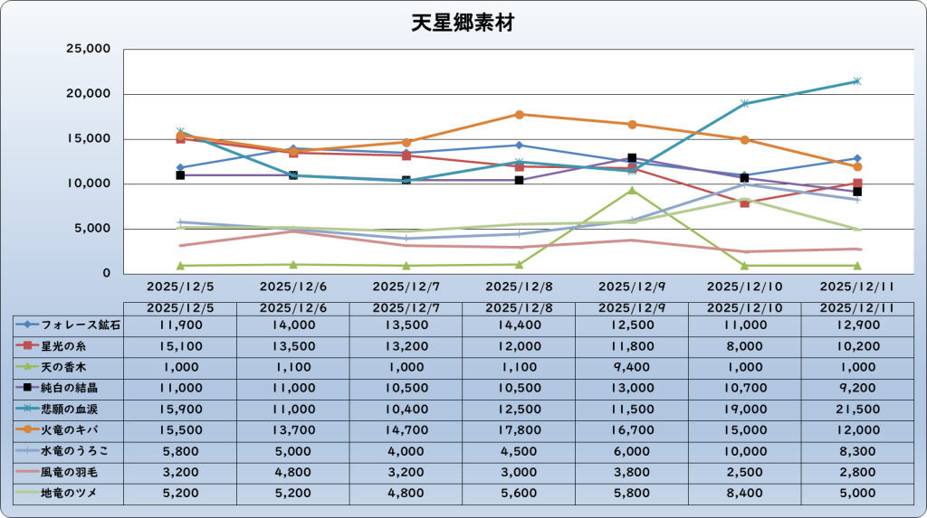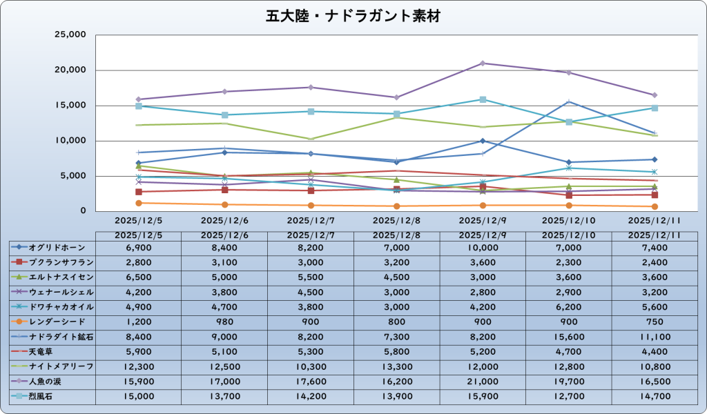 それでは、2025年12月11日までの1週間分のバザー相場の動きを載せています。