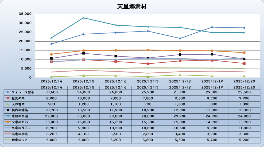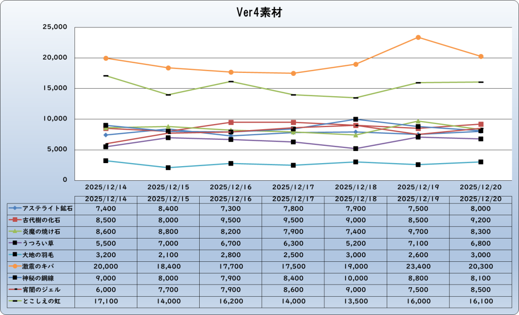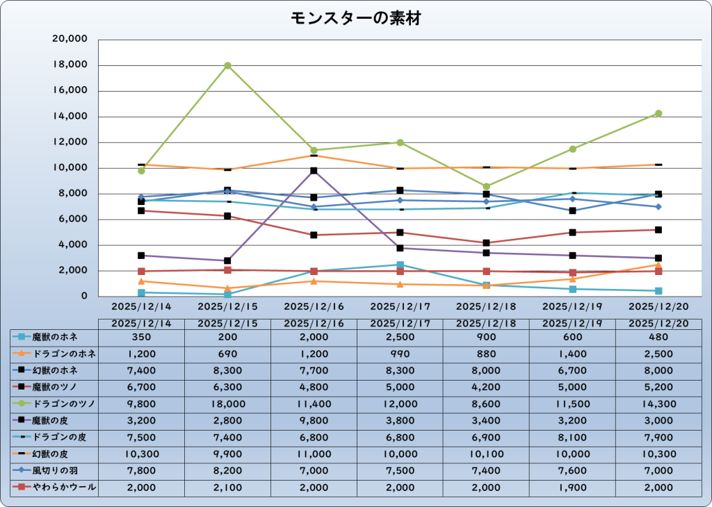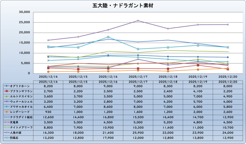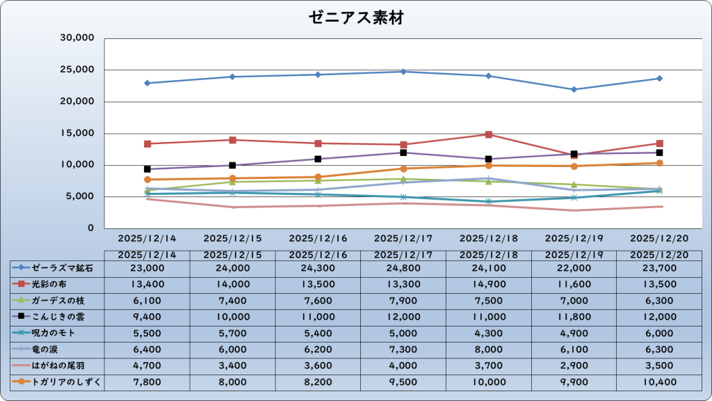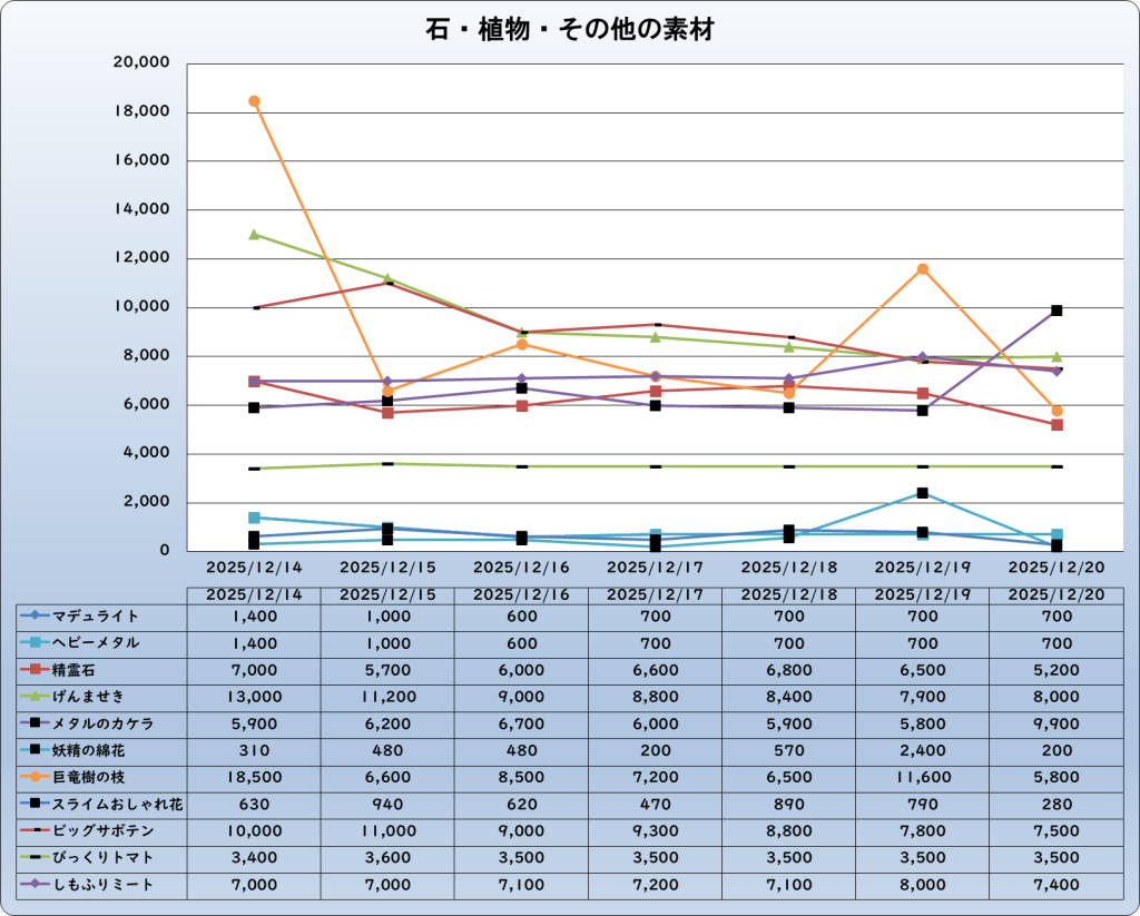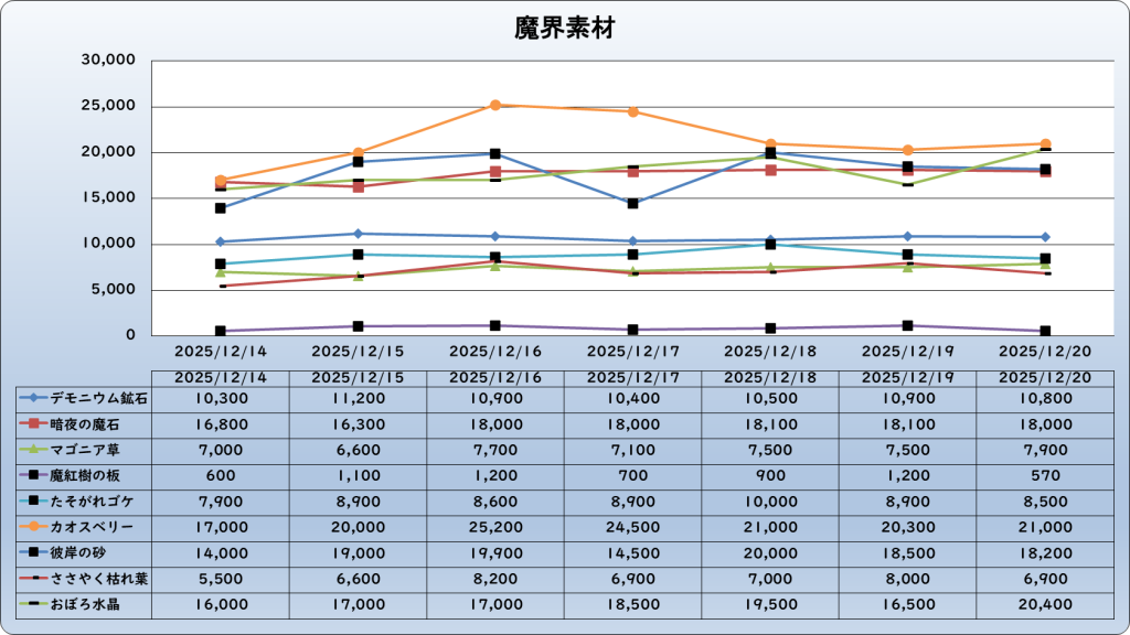 それでは、2025年12月20日までの1週間分のバザー相場の動きを載せています。