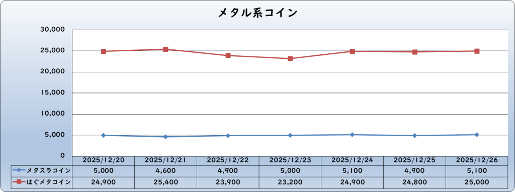 | はぐメタコイン | 25,000 | -500 | -2.0% | 25,500 |