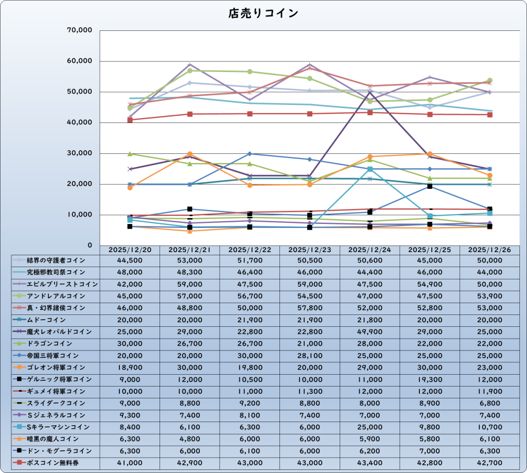 | 究極邪教司祭コイン | 44,000 | -1,500 | -3.3% | 45,500 |