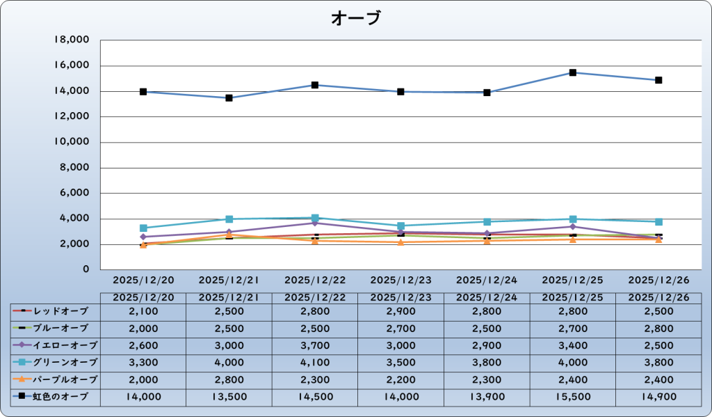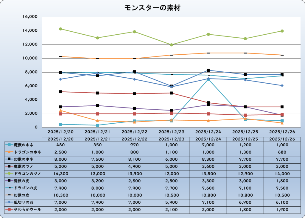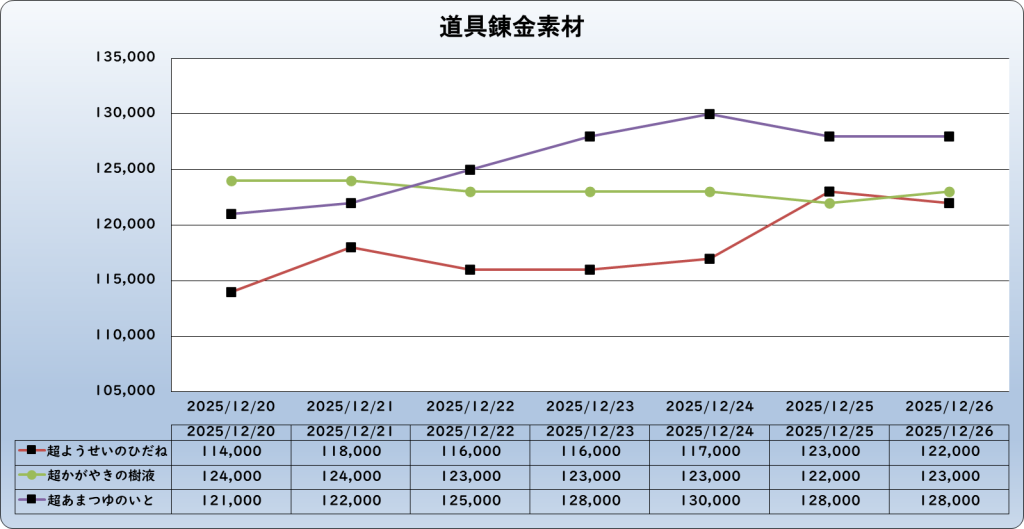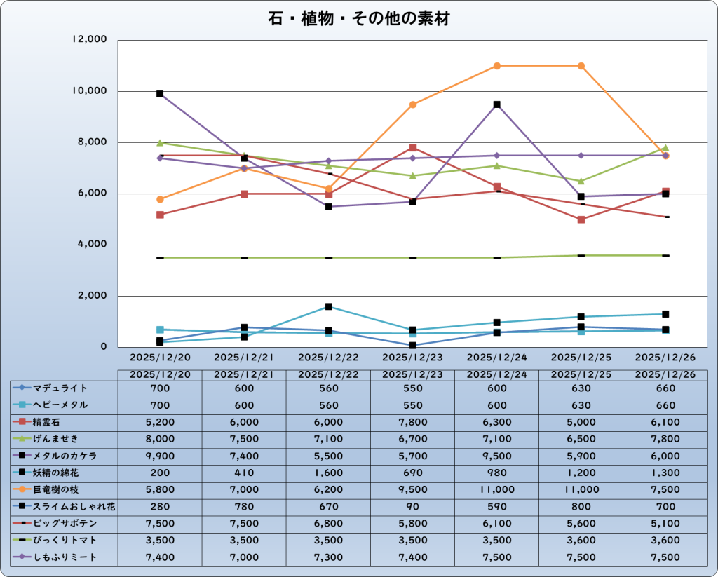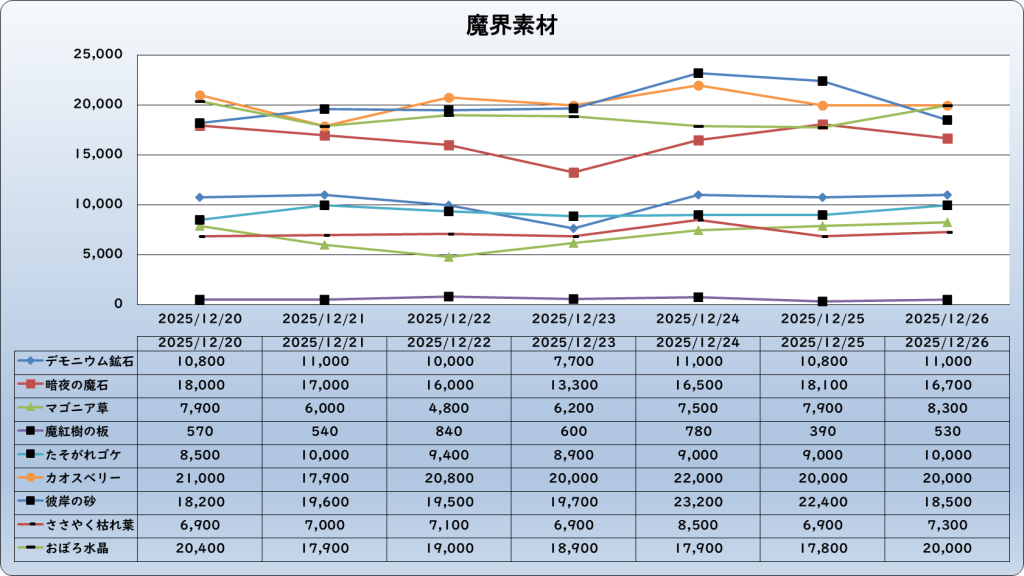 それでは、2025年12月26日までの1週間分のバザー相場の動きを載せています。