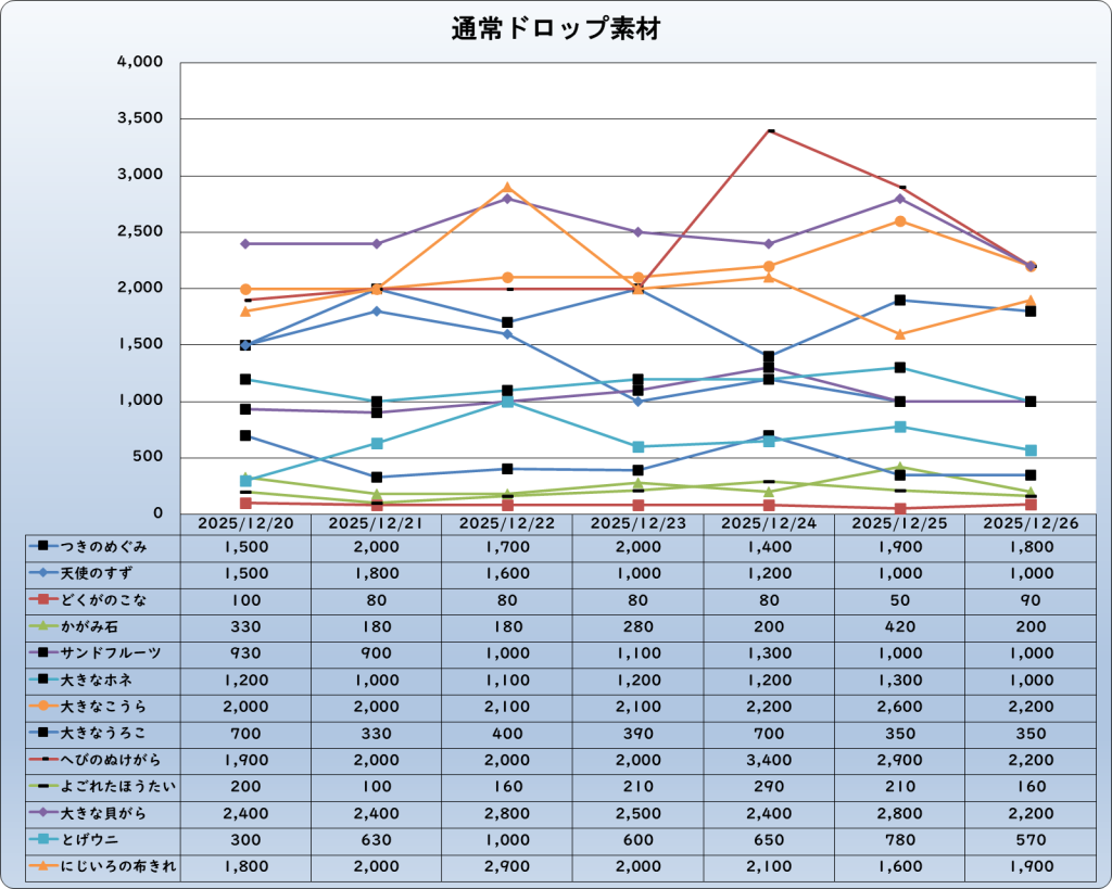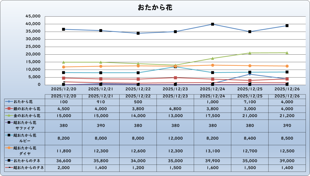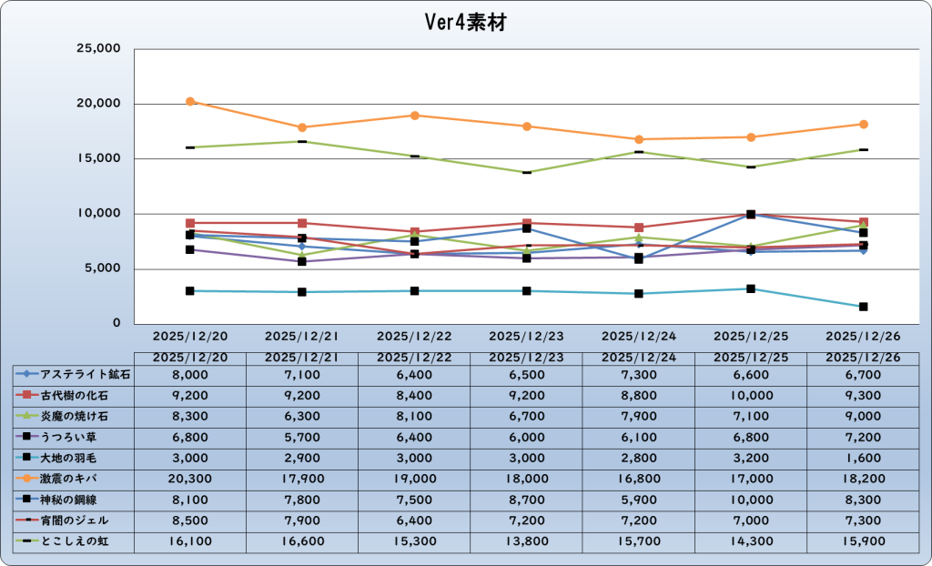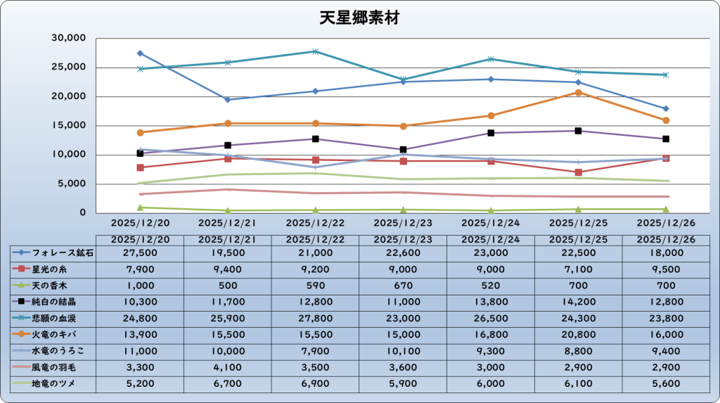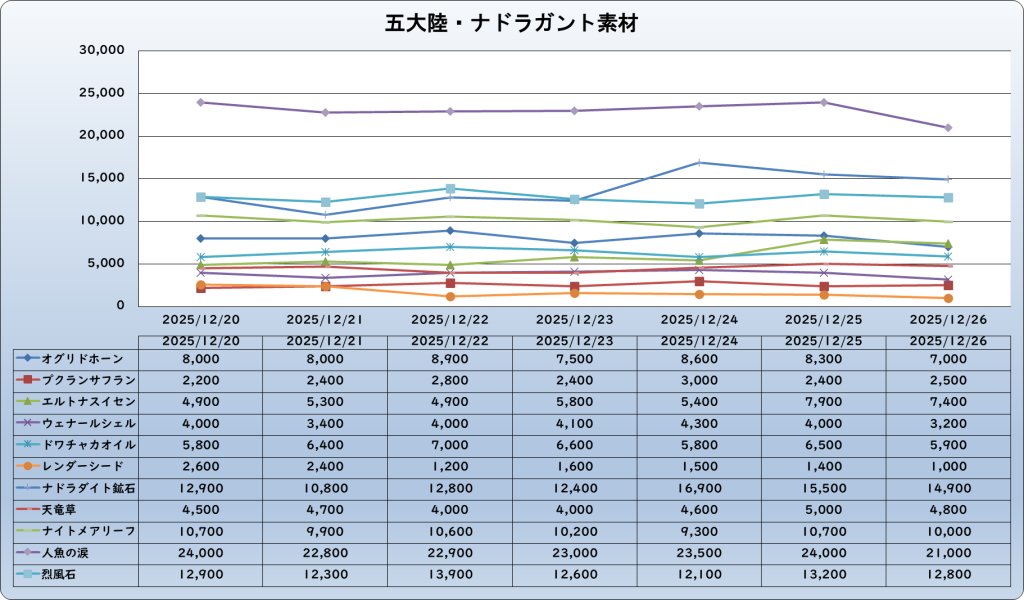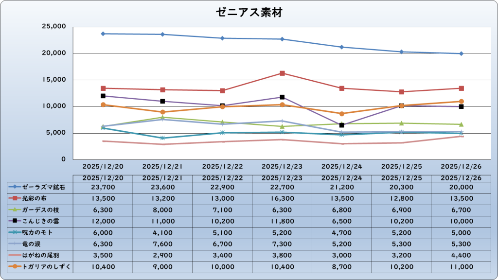 それでは、2025年12月26日までの1週間分のバザー相場の動きを載せています。