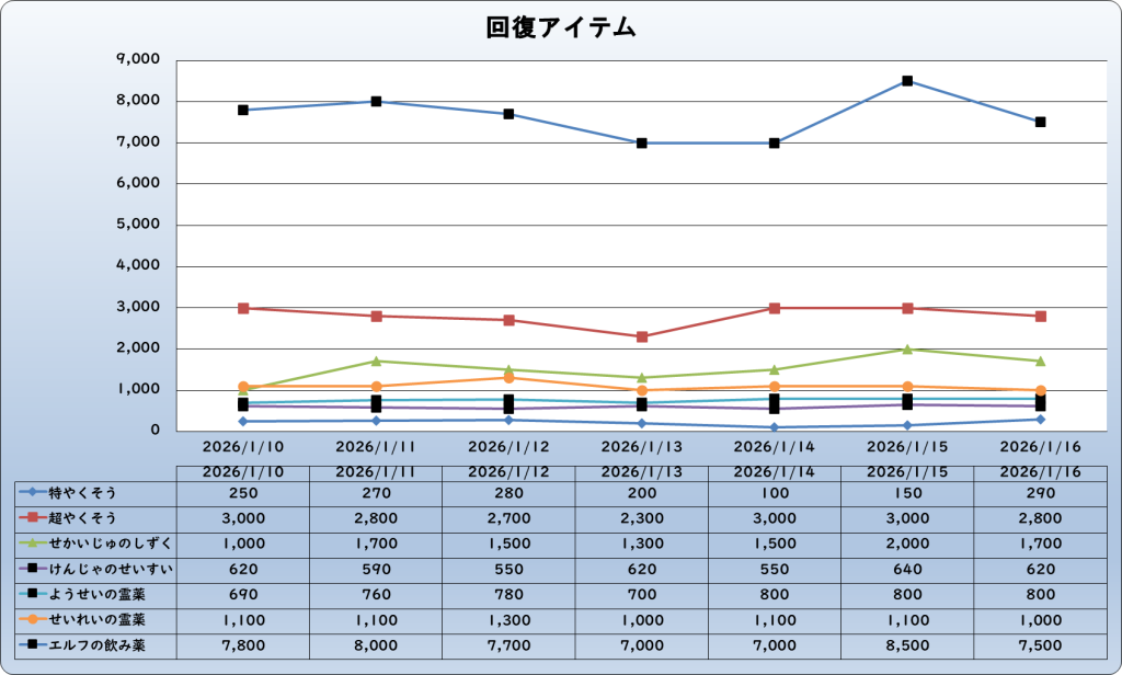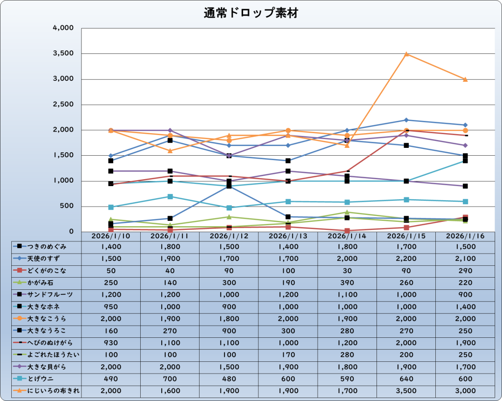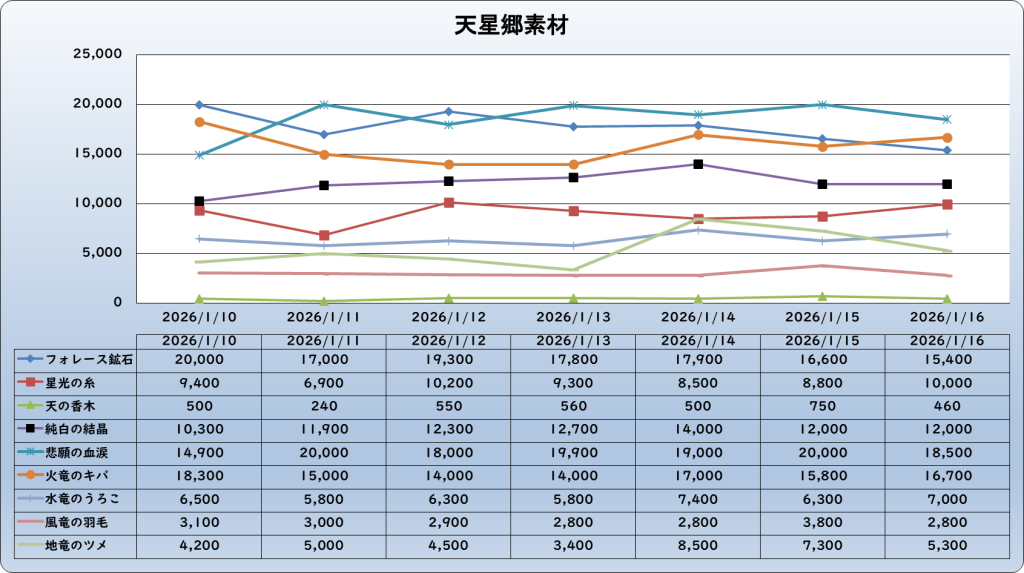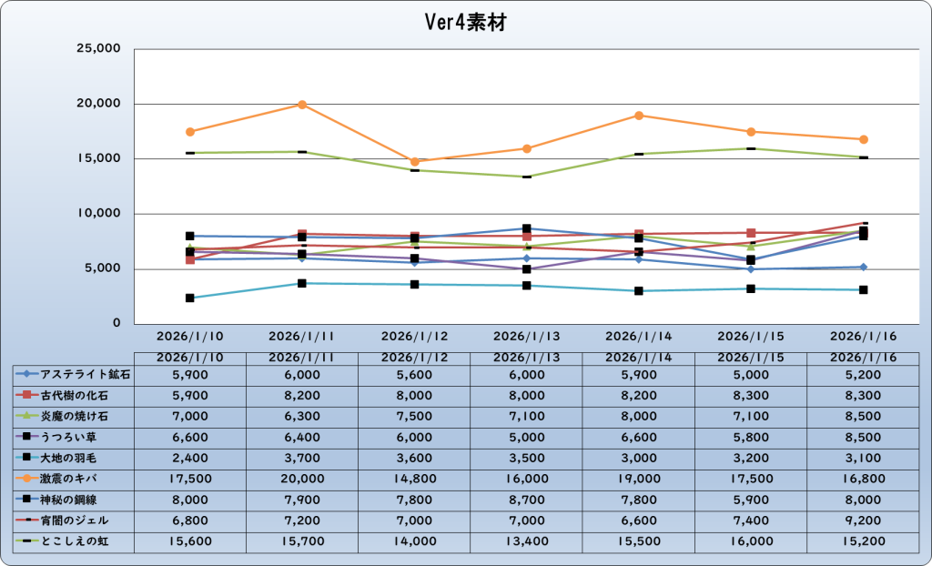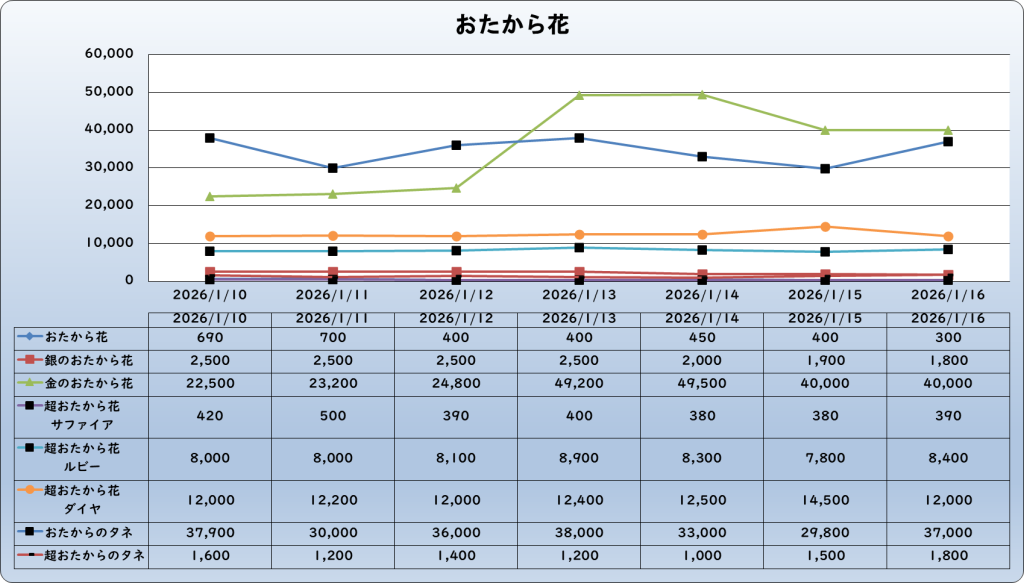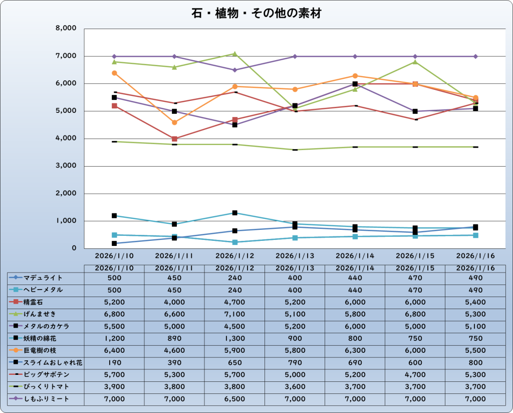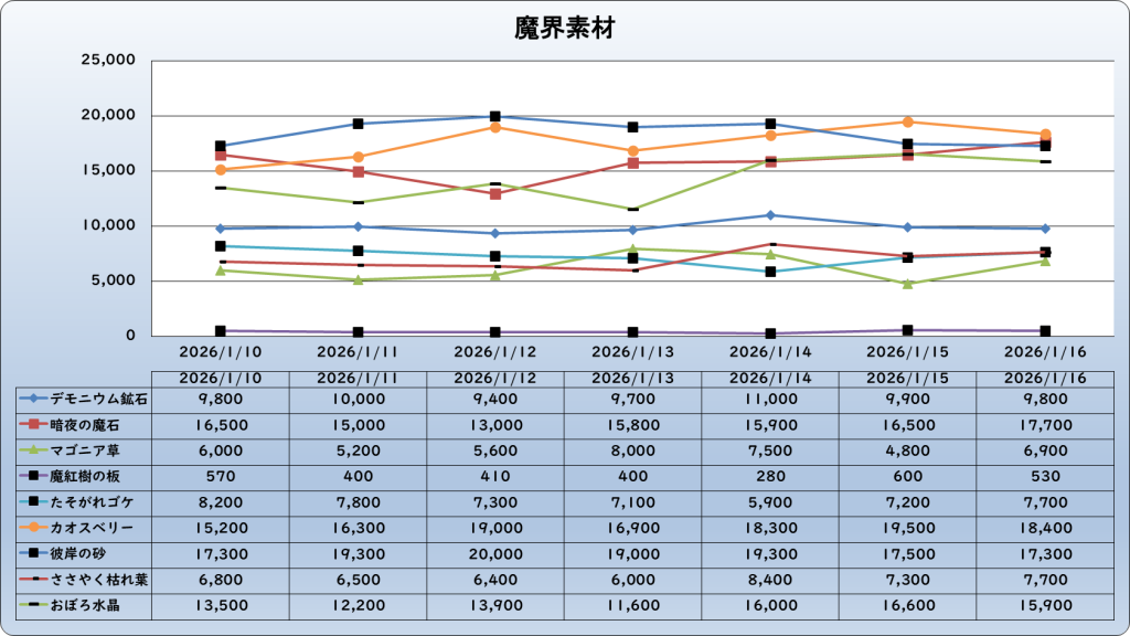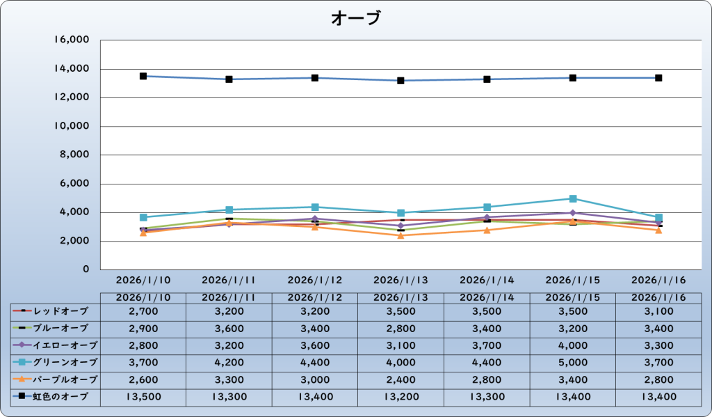 それでは、2026年1月16日までの1週間分のバザー相場の動きを載せています。