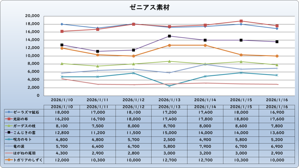 | ゼーラズマ鉱石 | 16,900 | -1,300 | -7.1% | 18,200 |