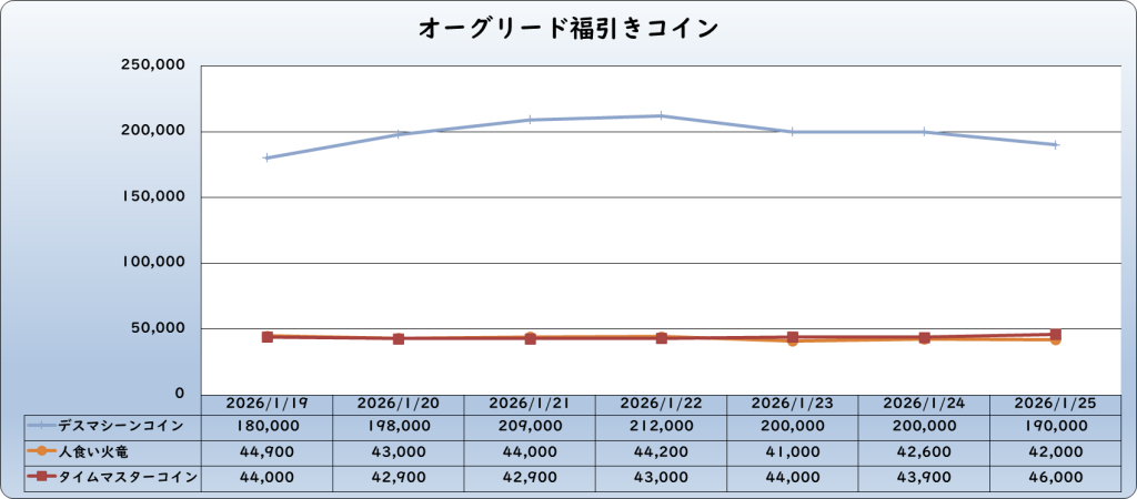 デスマシーンコイン】は20万G前後、【破壊神フォロボスコイン】は27~28万G前後で落ち着きを見せ始めたみたいですね。