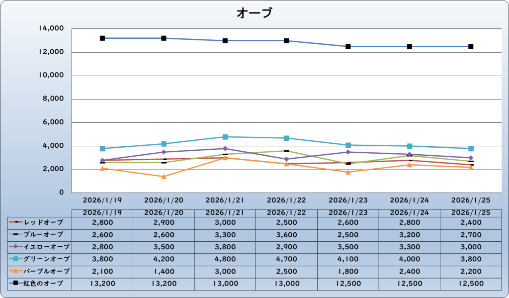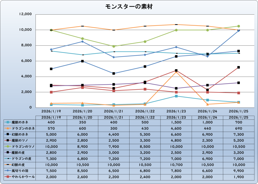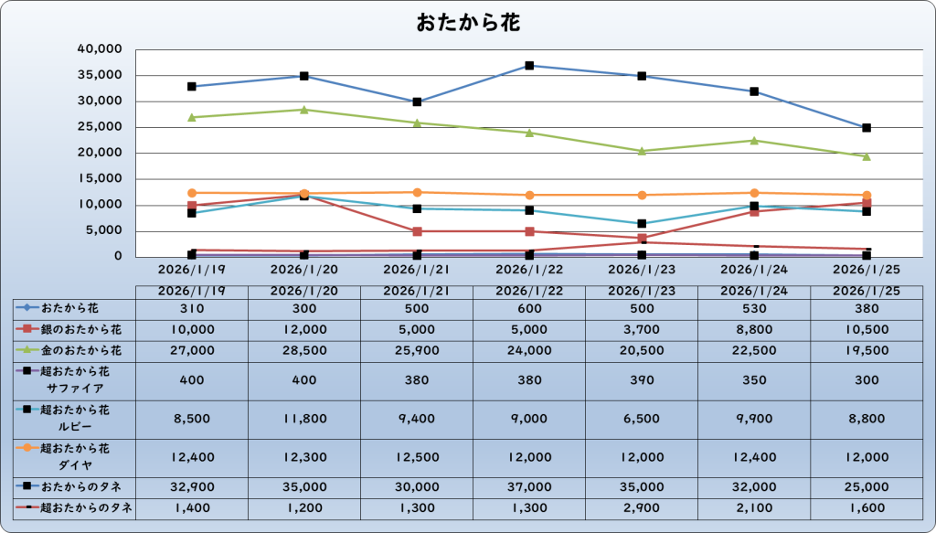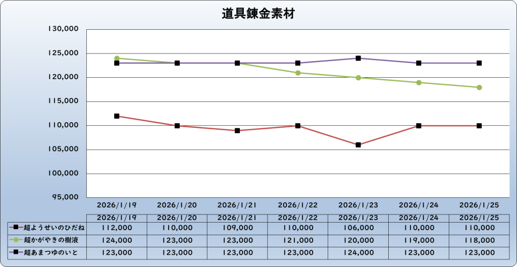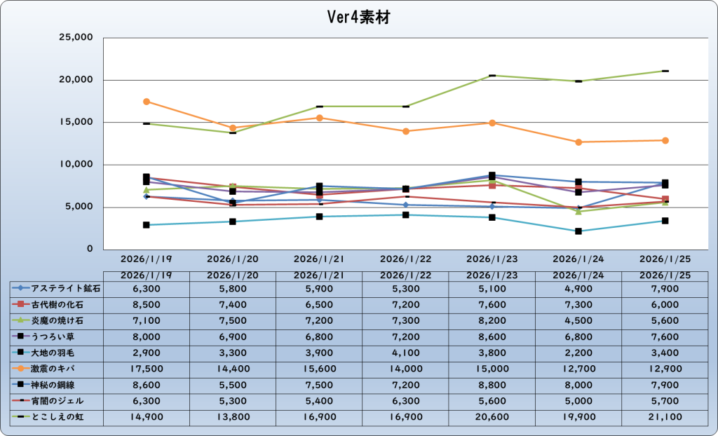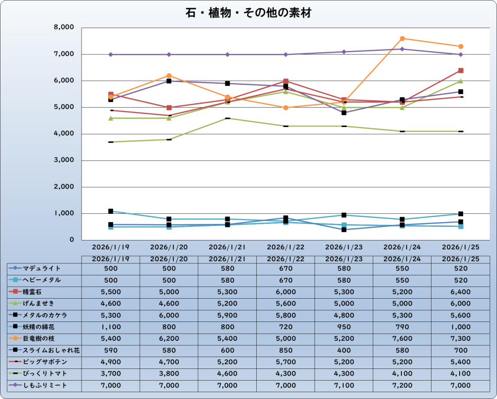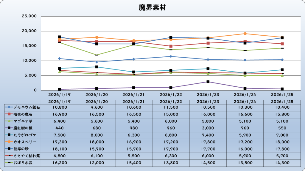それでは、2026年1月25日までの1週間分のバザー相場の動きを載せています。