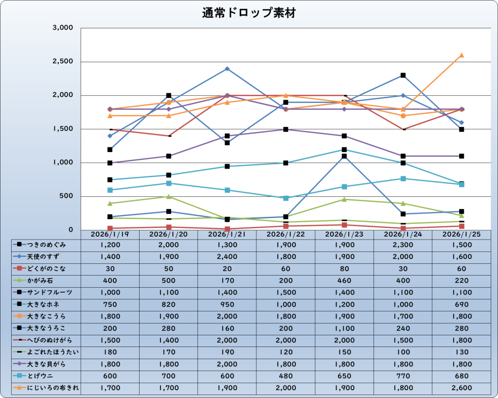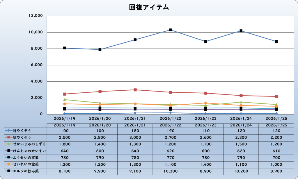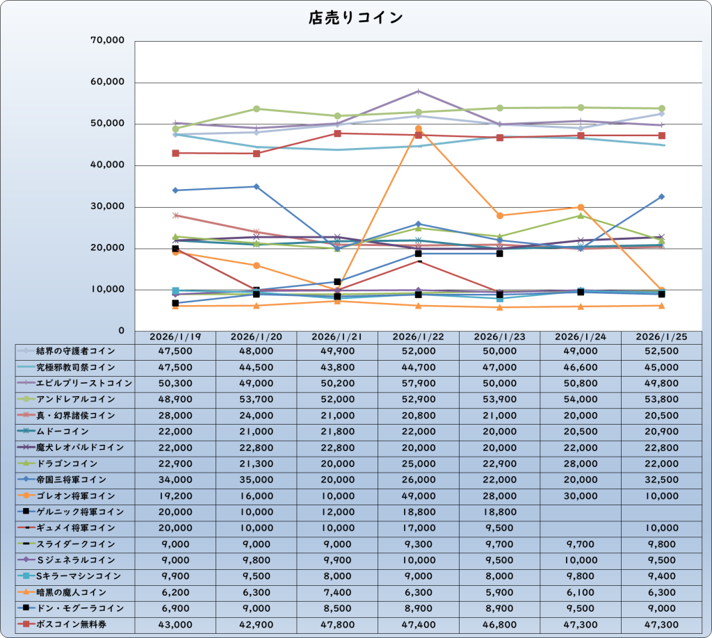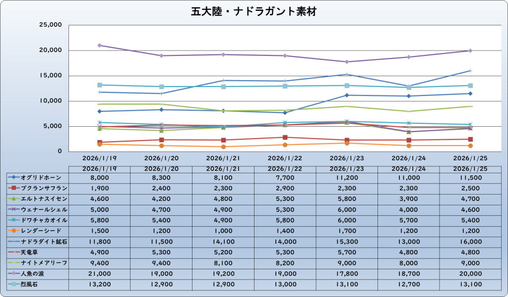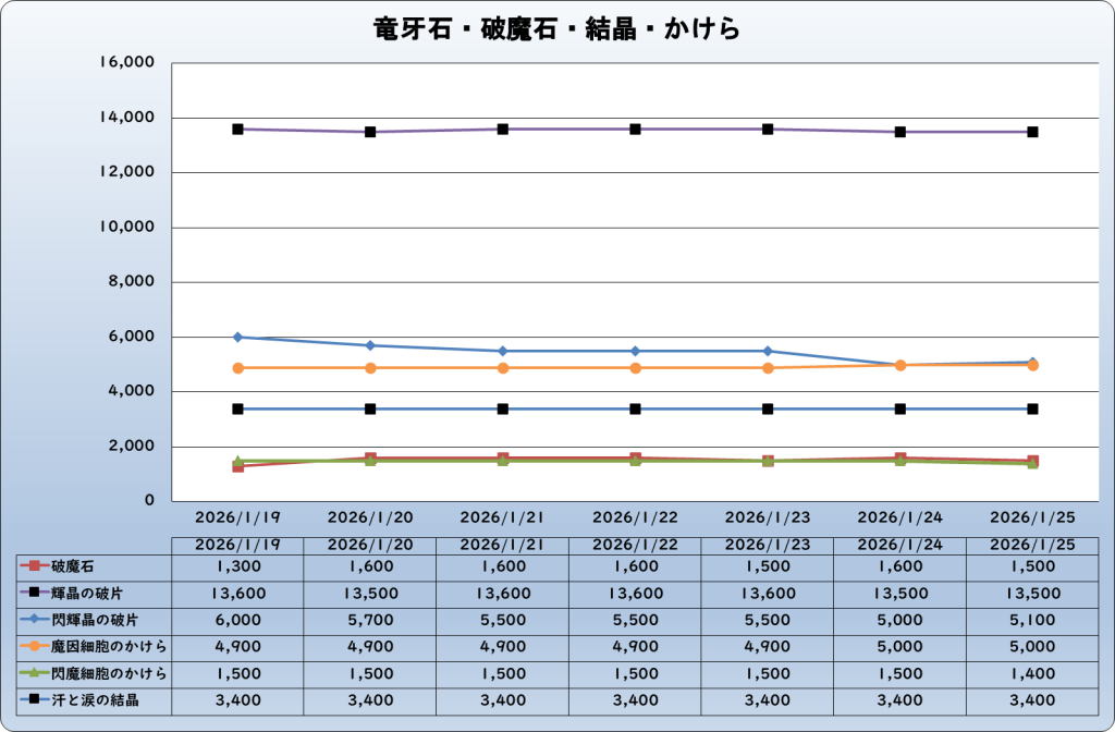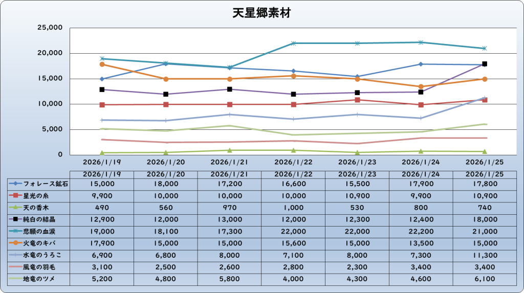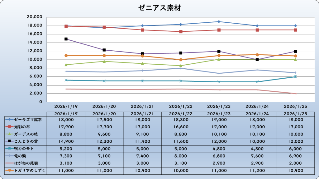 それでは、2026年1月25日までの1週間分のバザー相場の動きを載せています。