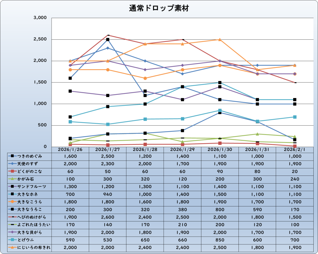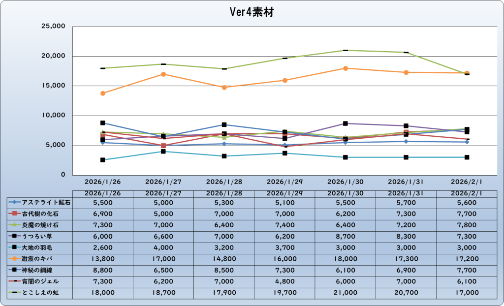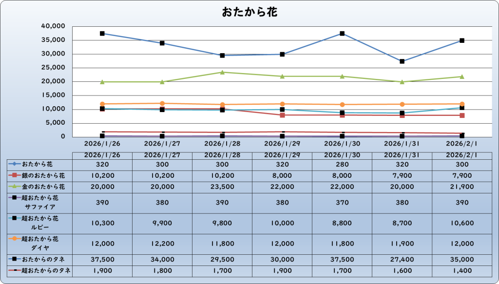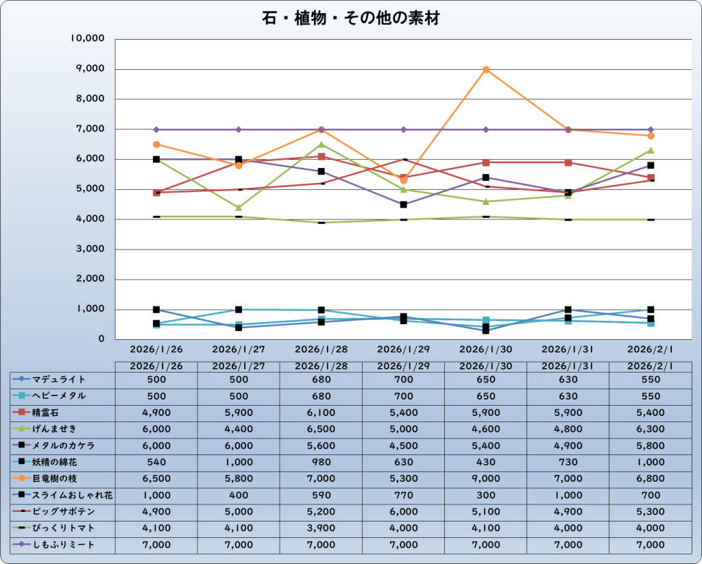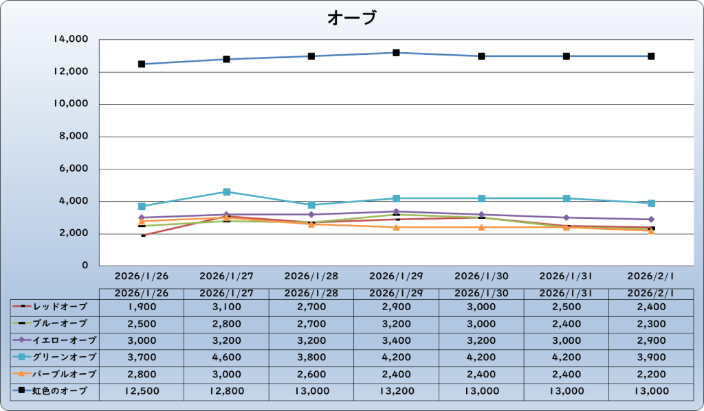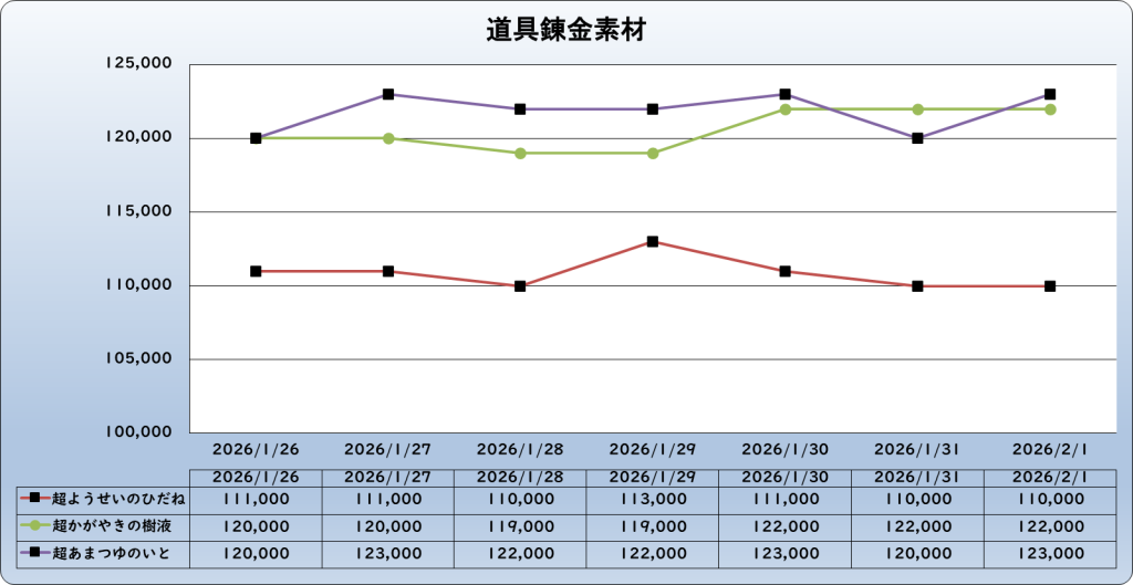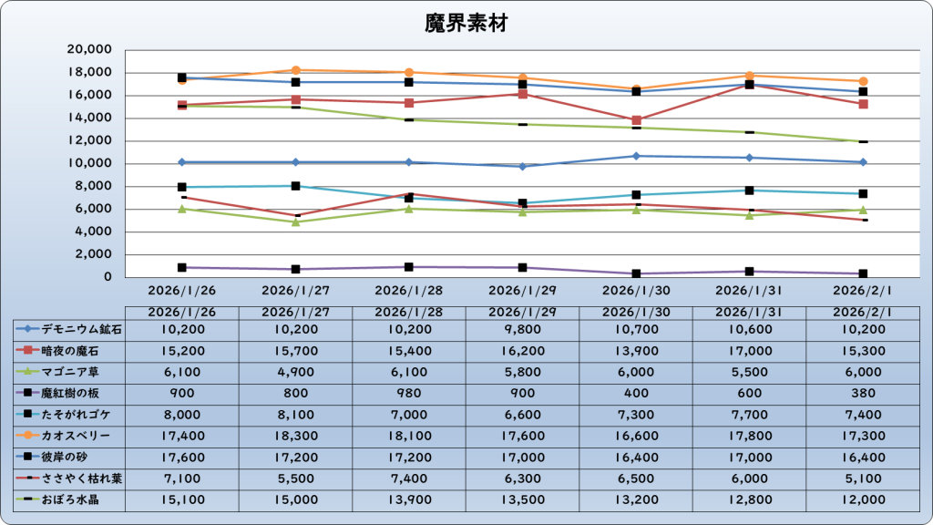 それでは、2026年2月1日までの1週間分のバザー相場の動きを載せています。