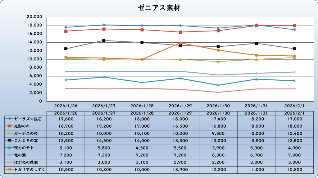 | ゼーラズマ鉱石 | 17,000 | -1,000 | -5.6% | 18,000 |