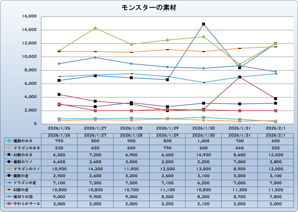 | 魔獣の皮 | 3,100 | -100 | -3.1% | 3,200 |
