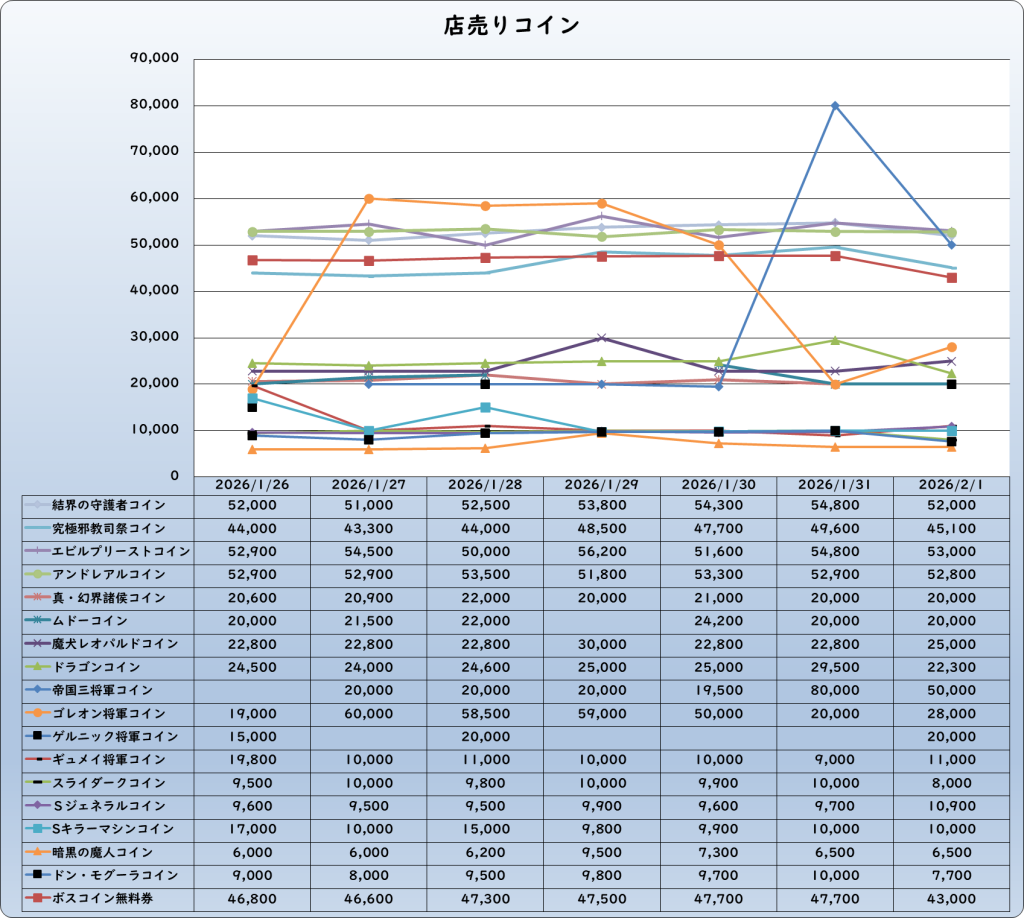 | 結界の守護者コイン | 52,000 | -500 | -1.0% | 52,500 |