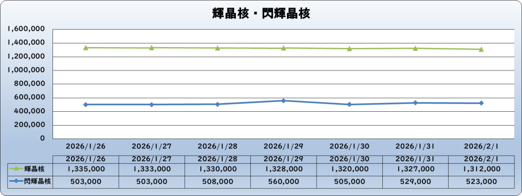 | 輝晶核 | 1,312,000 | -25,000 | -1.9% | 1,337,000 |