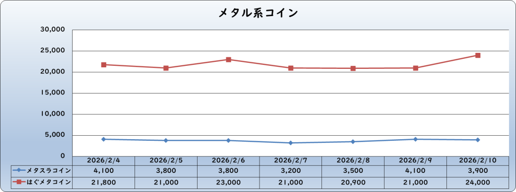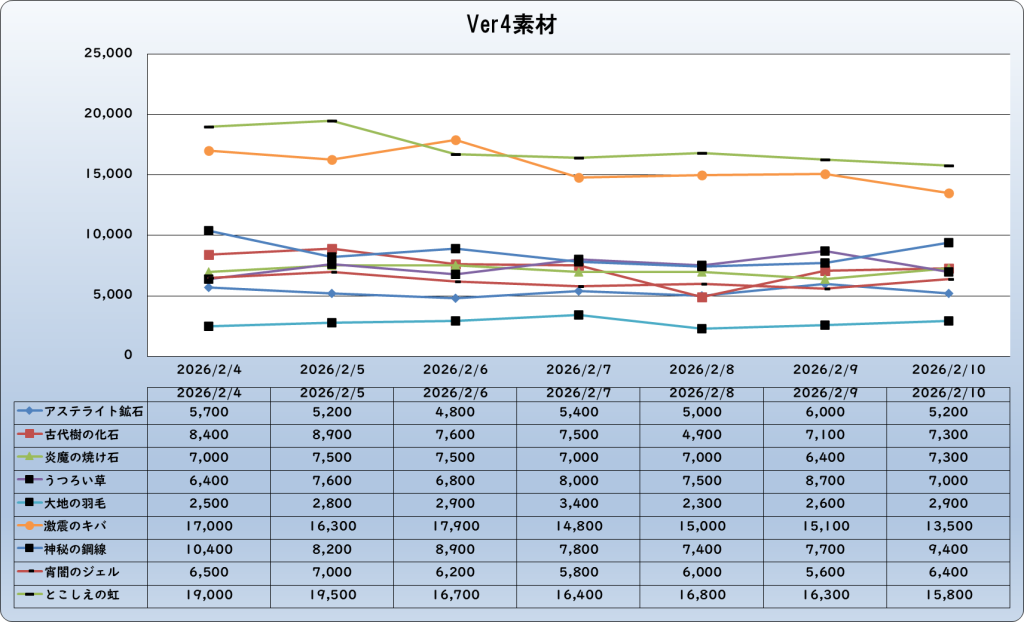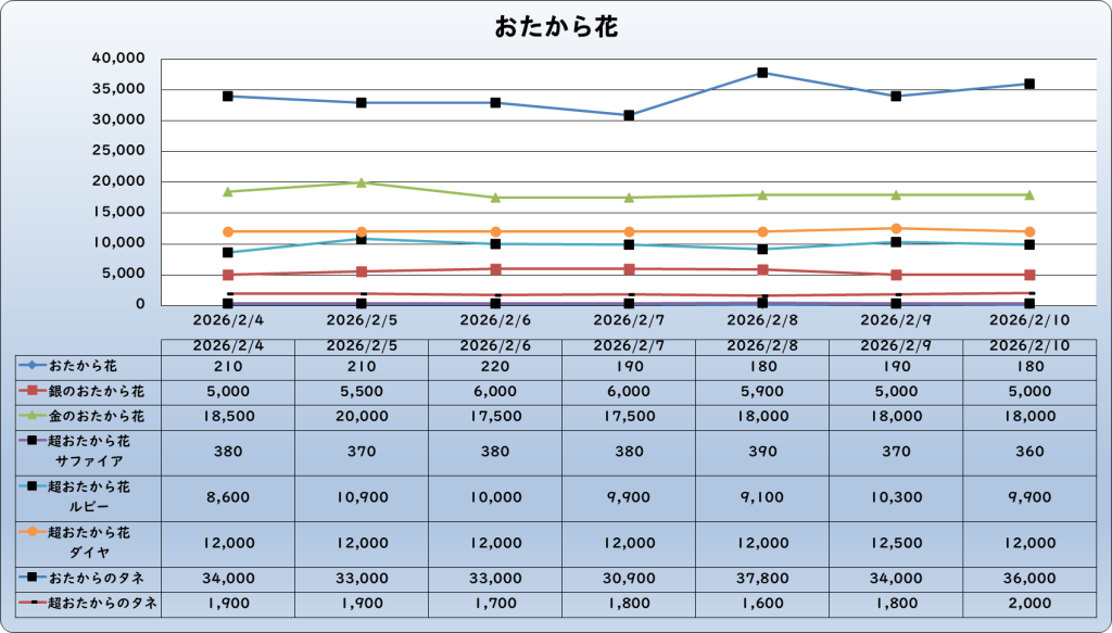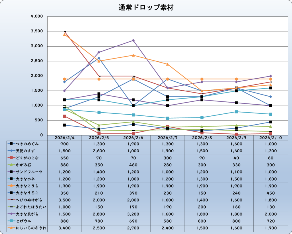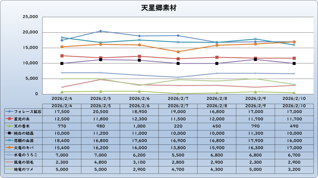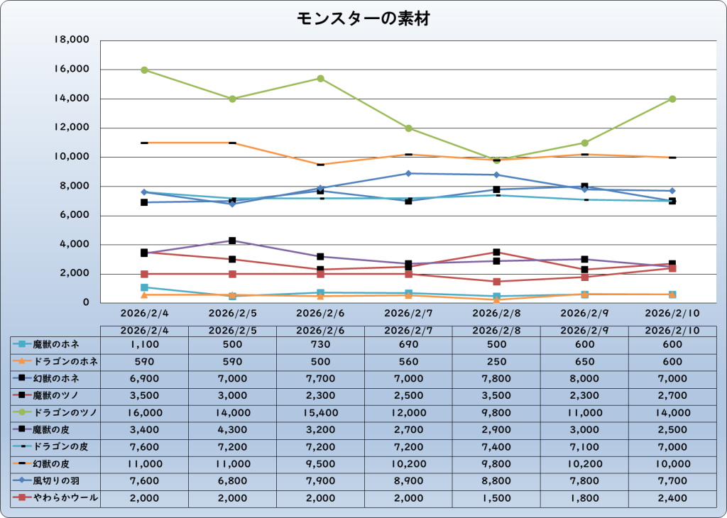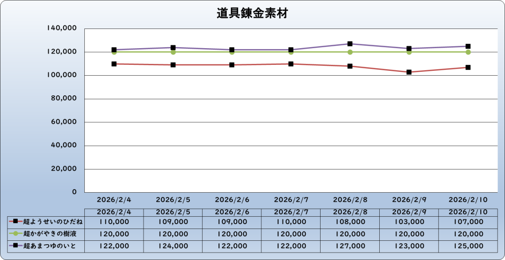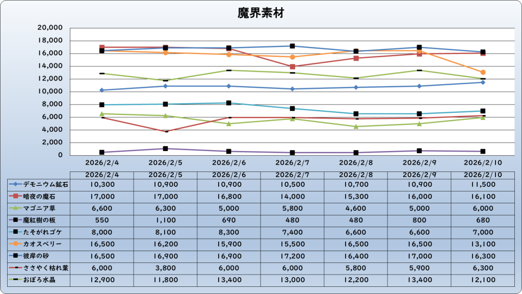 それでは、2026年2月10日までの1週間分のバザー相場の動きを載せています。