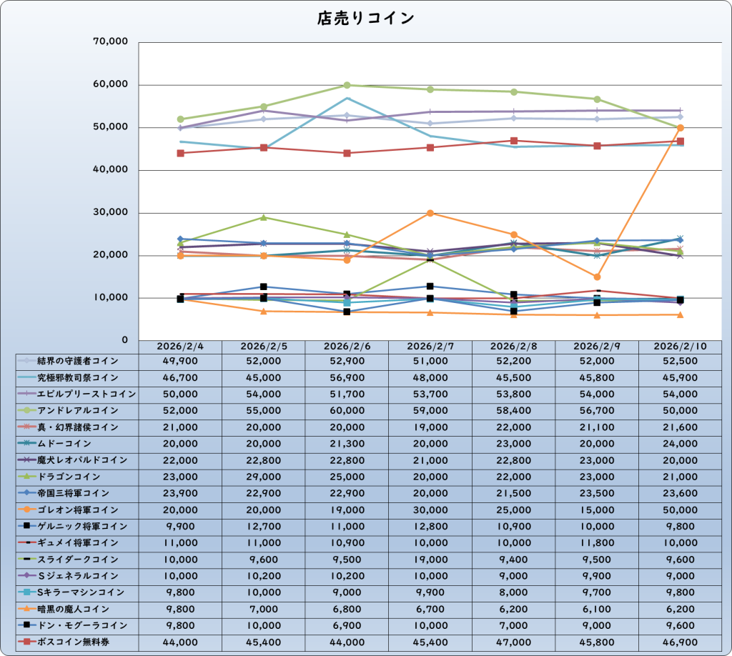 | 結界の守護者コイン | 52,500 | -1,200 | -2.2% | 53,700 |