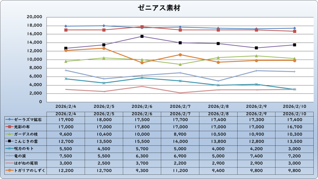 | ゼーラズマ鉱石 | 17,400 | -900 | -4.9% | 18,300 |