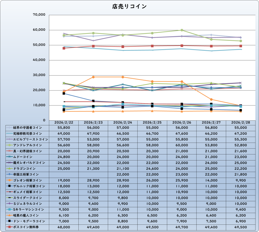 | 究極邪教司祭コイン | 47,200 | 1,200 | 2.6% | 46,000 |