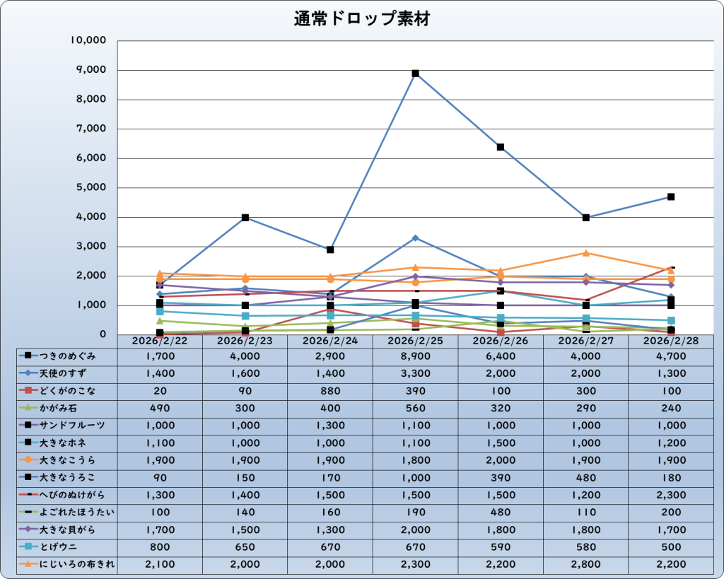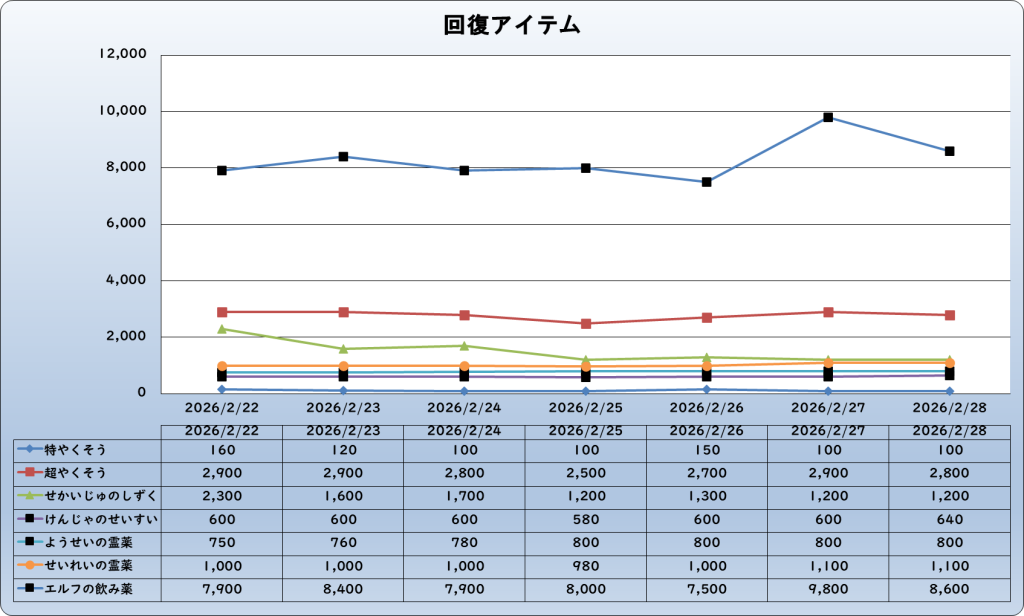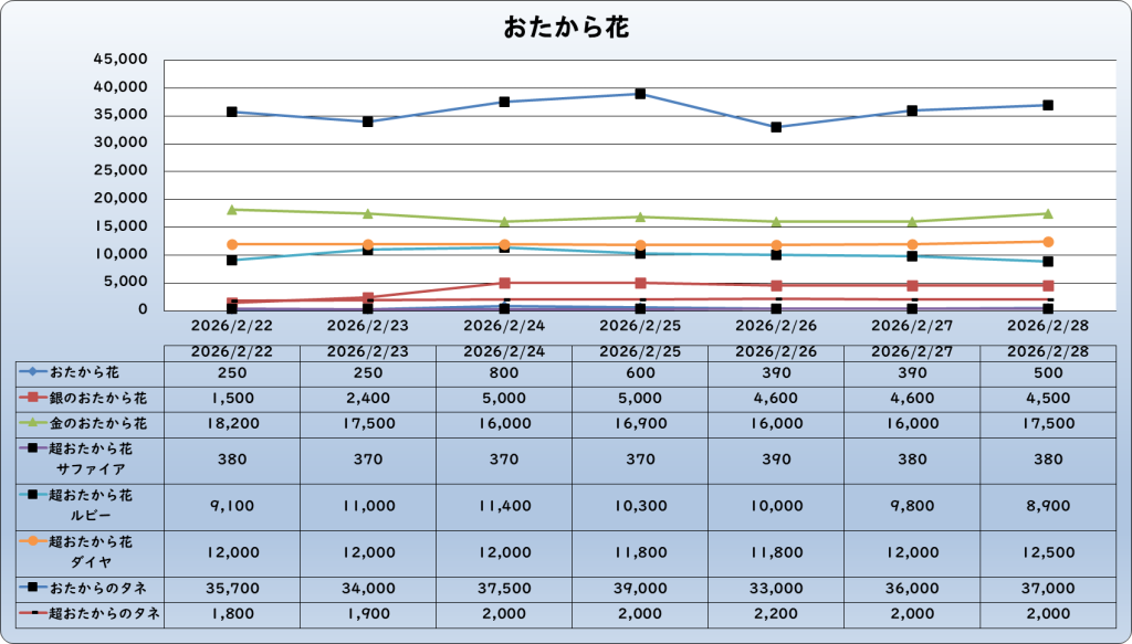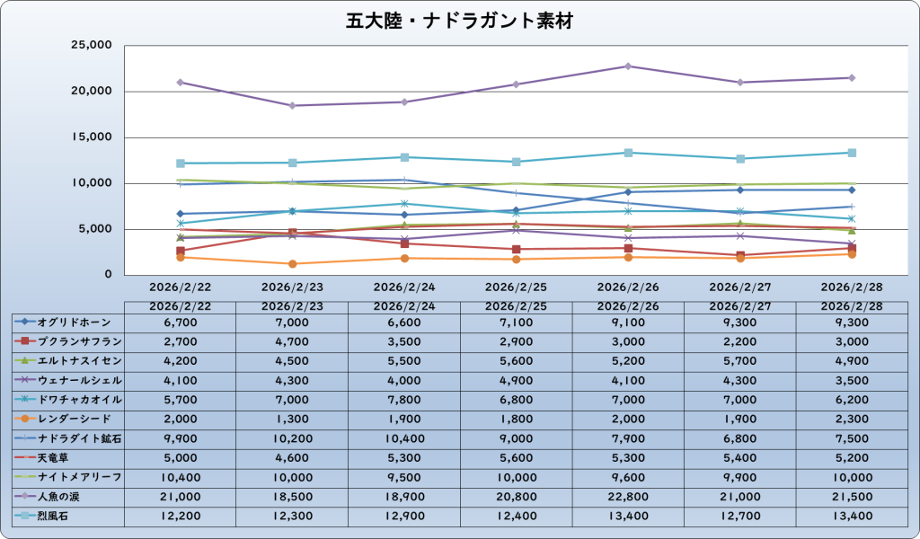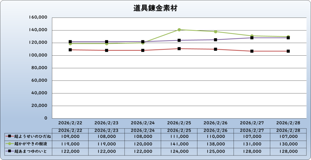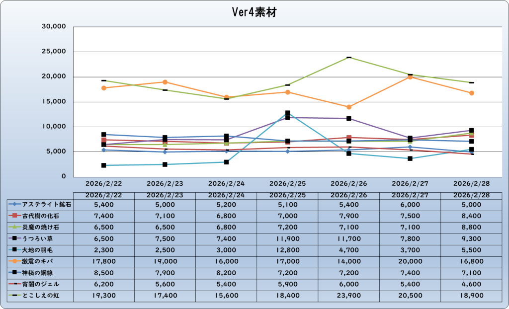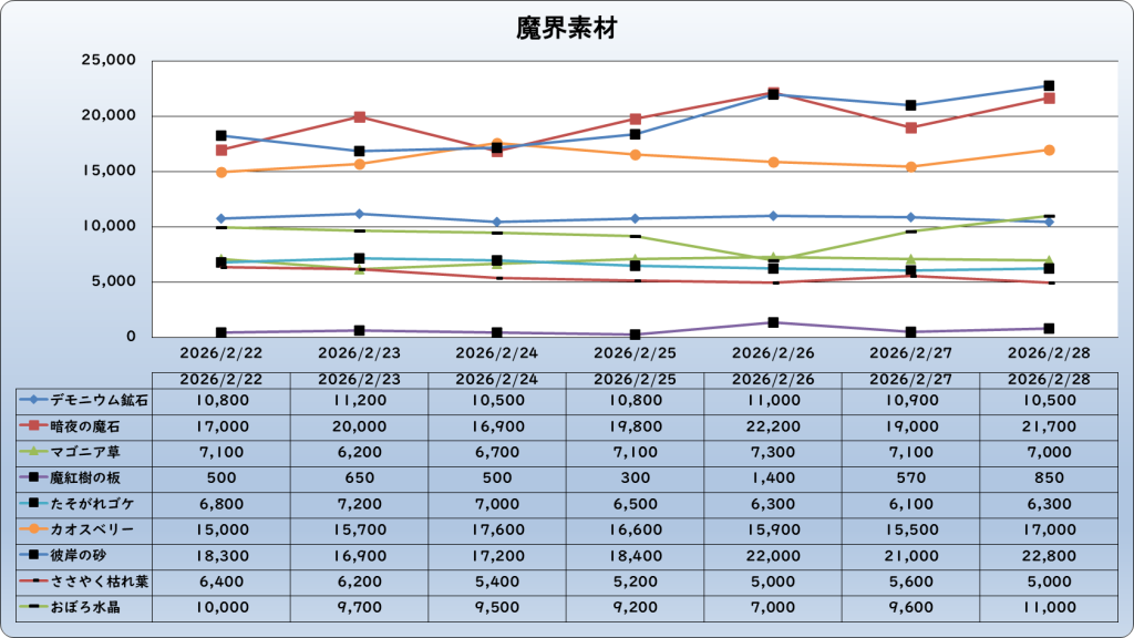 それでは、2026年2月28日までの1週間分のバザー相場の動きを載せています。