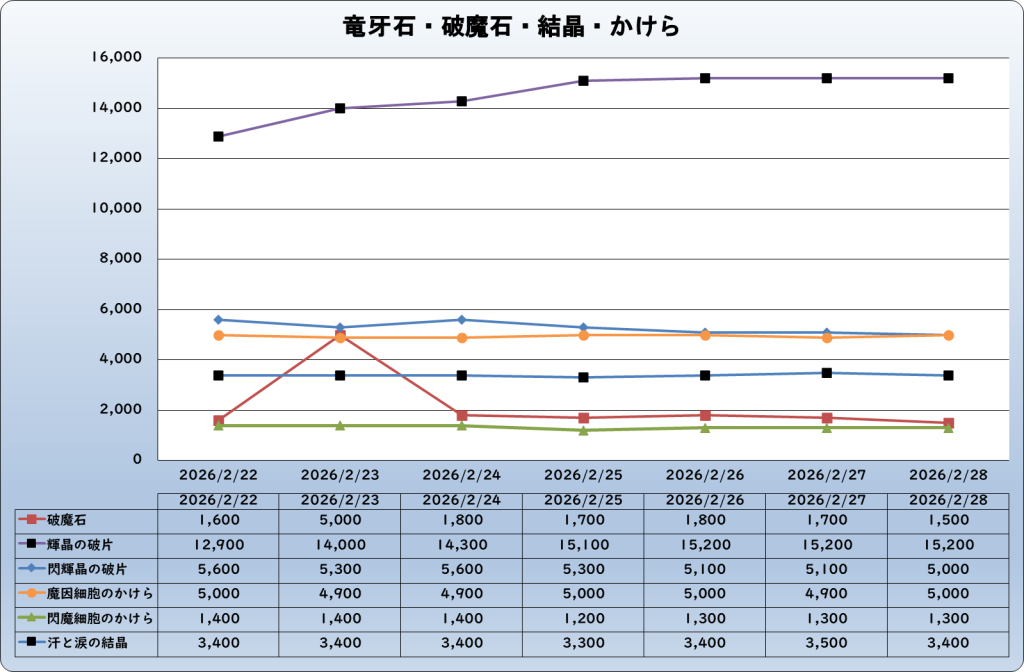 | 破魔石 | 1,500 | -200 | -11.8% | 1,700 |