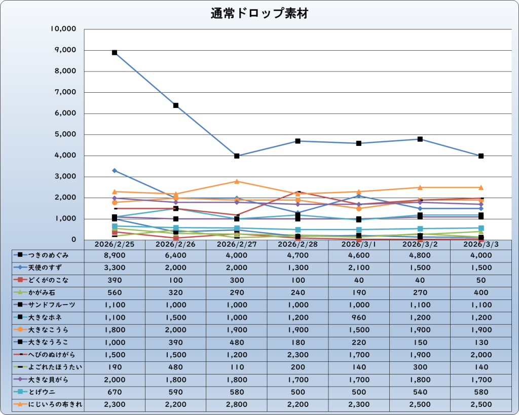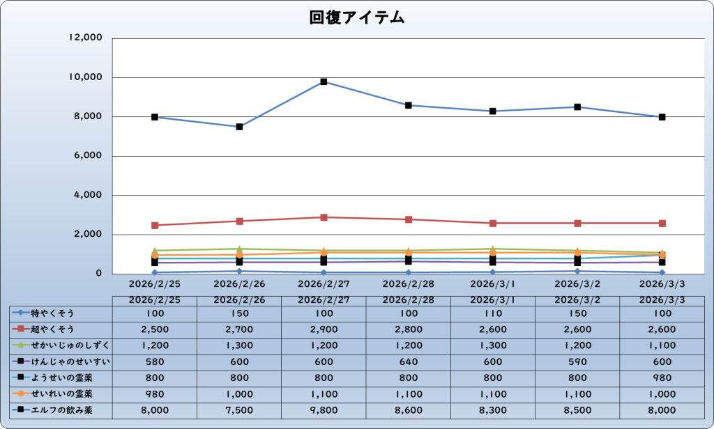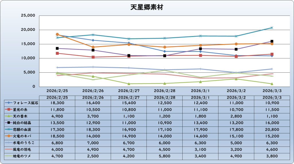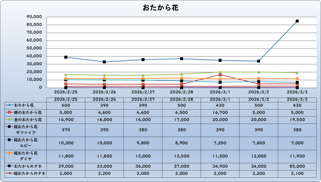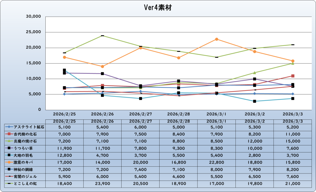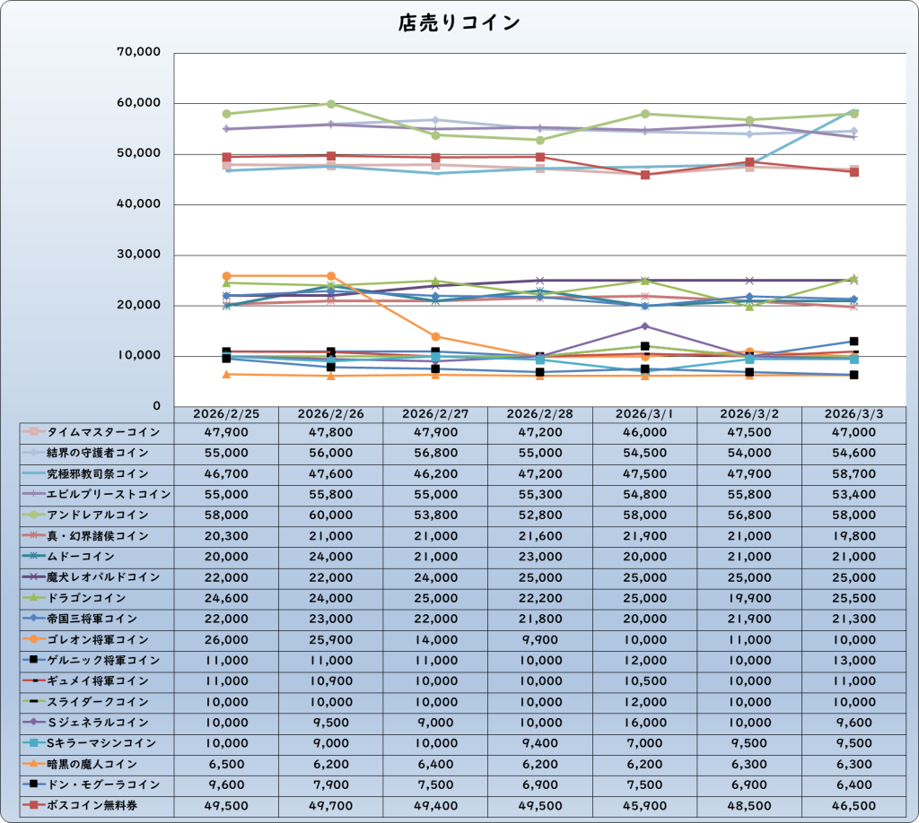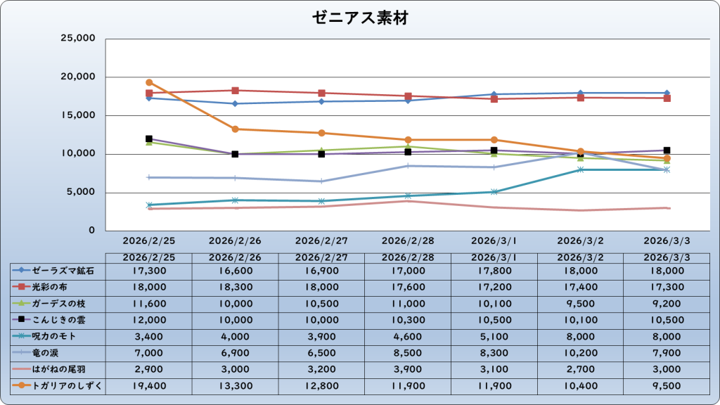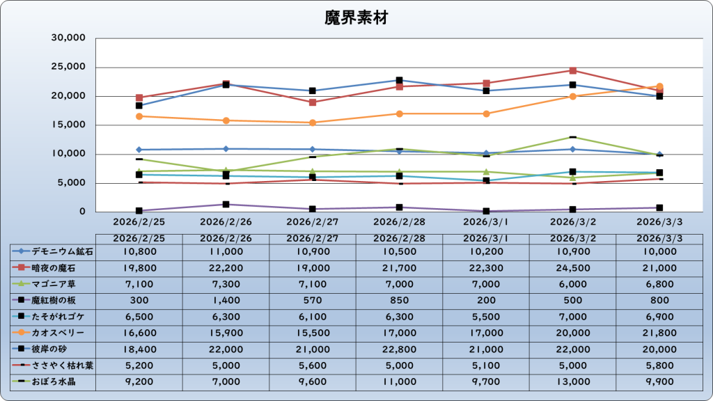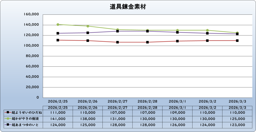 それでは、2026年3月3日までの1週間分のバザー相場の動きを載せています。