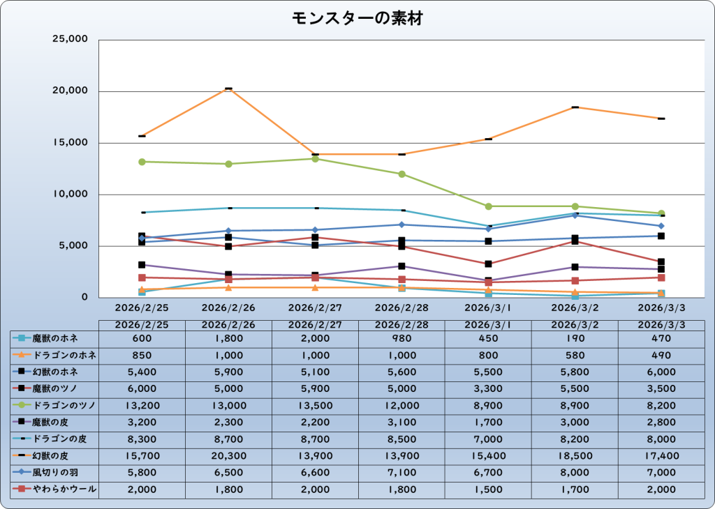 | 魔獣の皮 | 2,800 | -500 | -15.2% | 3,300 |