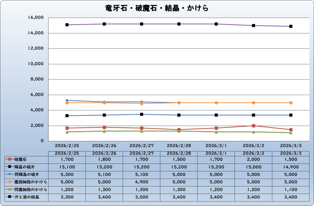 | 破魔石 | 1,500 | -300 | -16.7% | 1,800 |