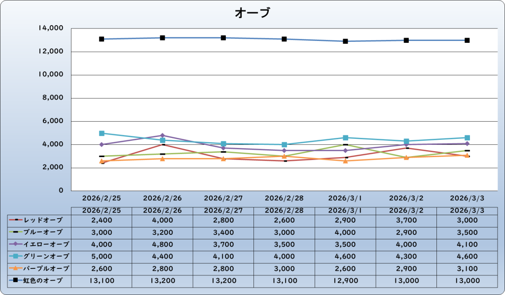 | 虹色のオーブ | 13,000 | 0 | 0.0% | 13,000 |