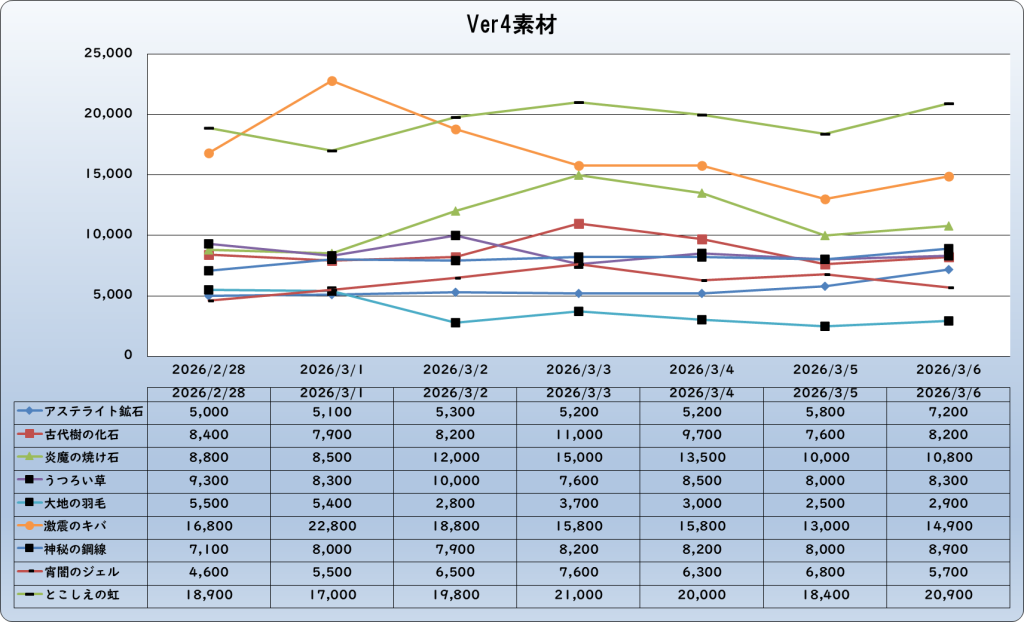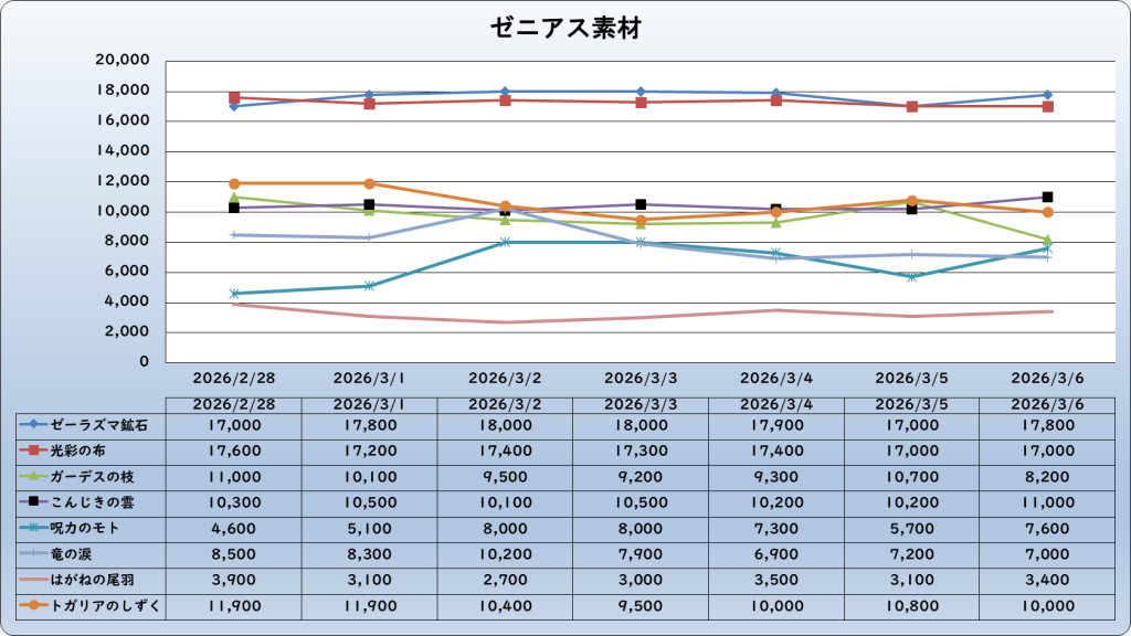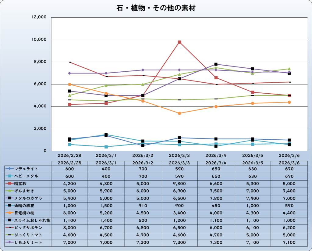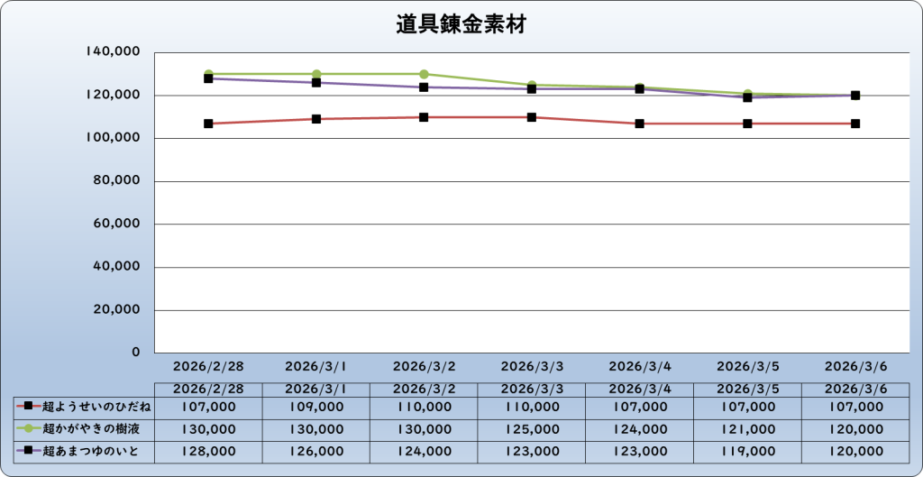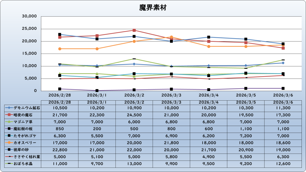 それでは、2026年3月6日までの1週間分のバザー相場の動きを載せています。
