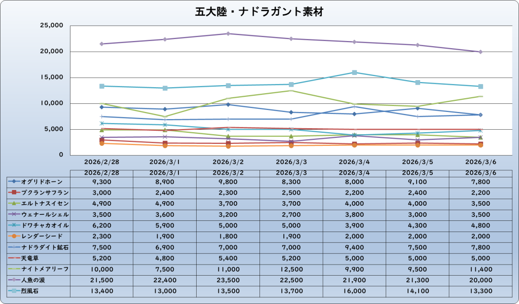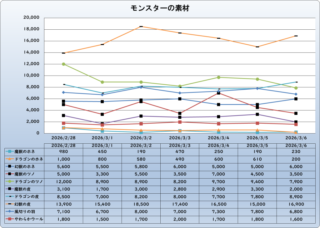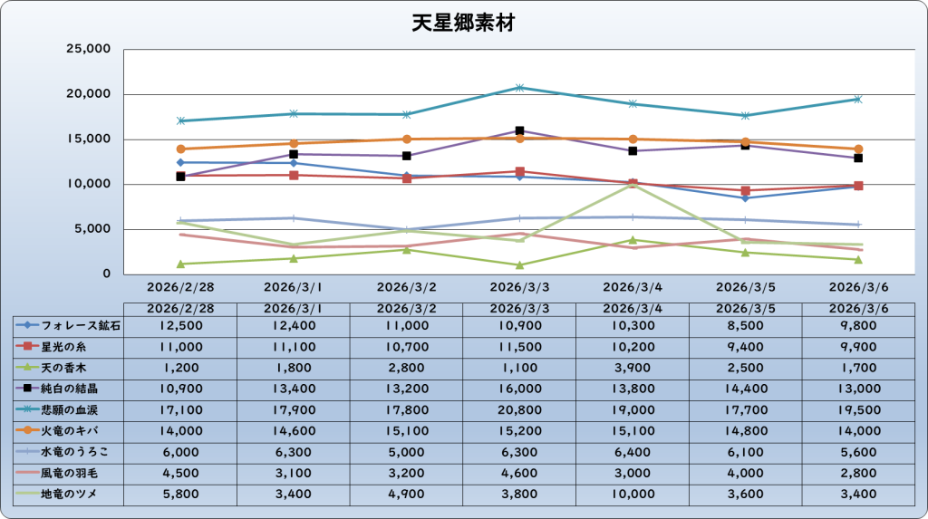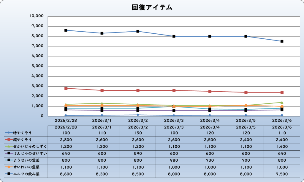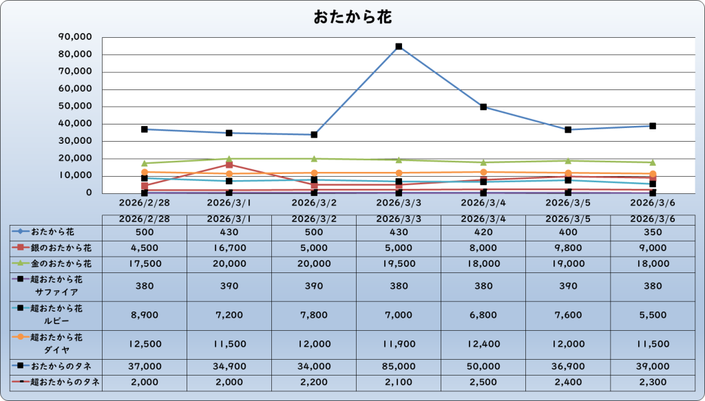 それでは、2026年3月6日までの1週間分のバザー相場の動きを載せています。
