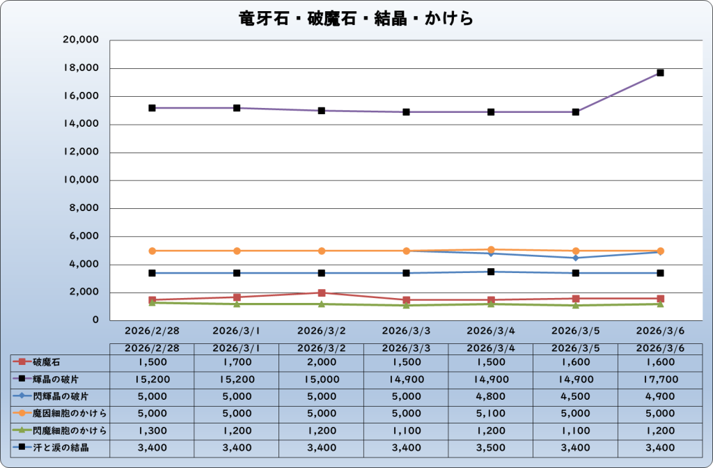 | 破魔石 | 1,600 | -100 | -5.9% | 1,700 |