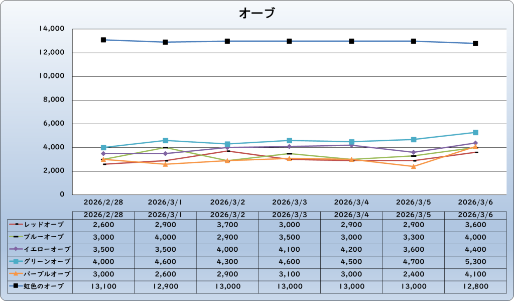 | 虹色のオーブ | 12,800 | -400 | -3.0% | 13,200 |