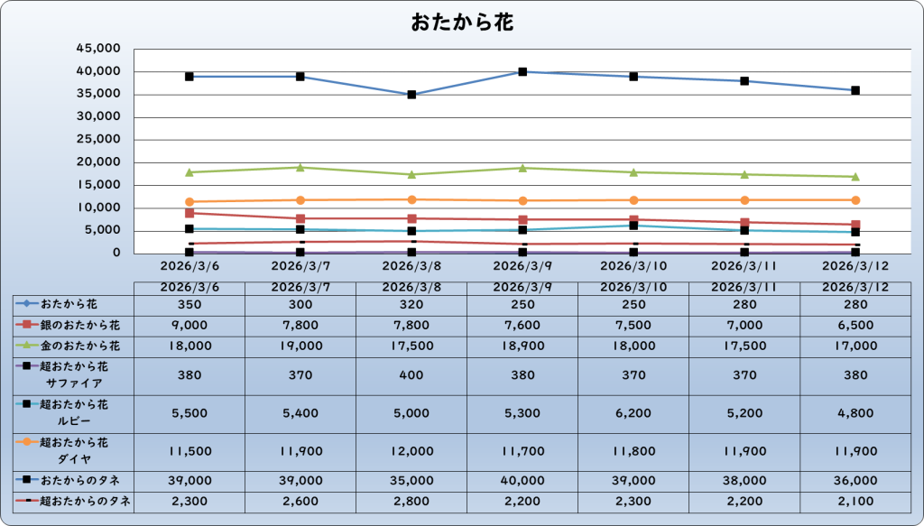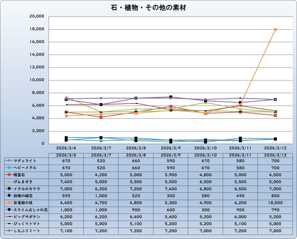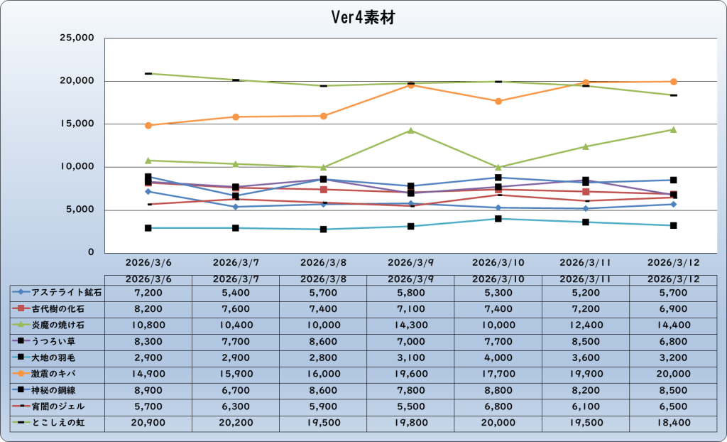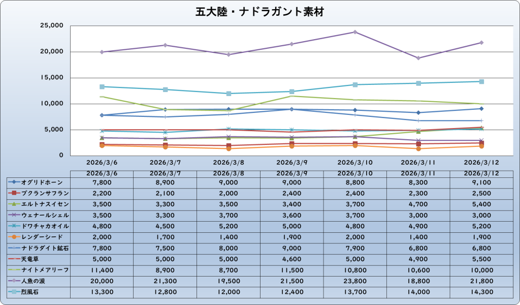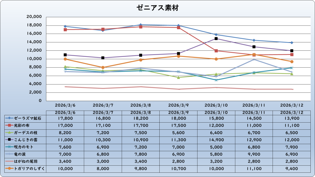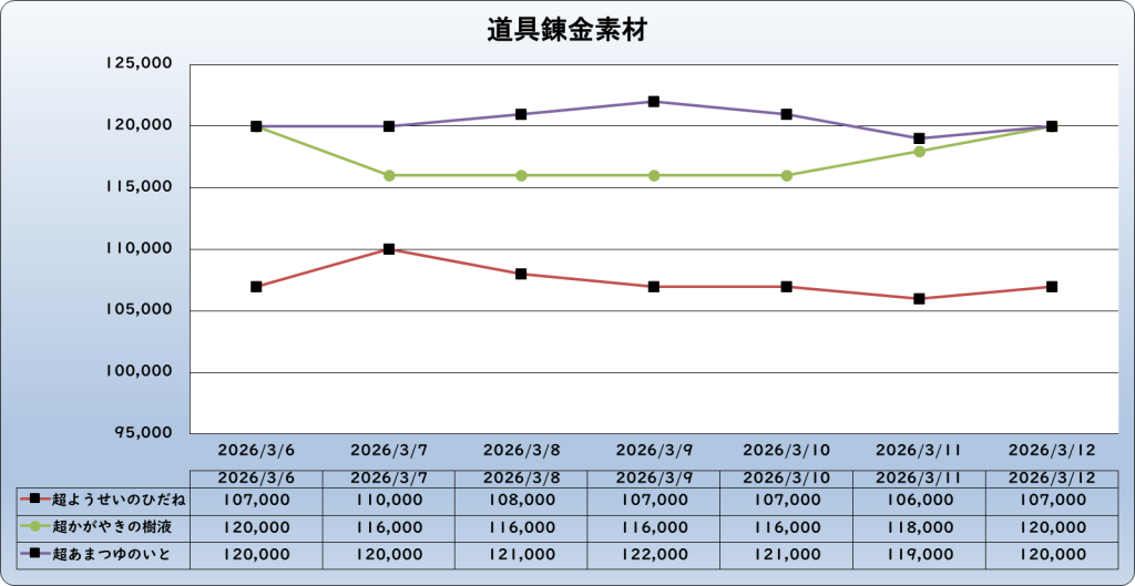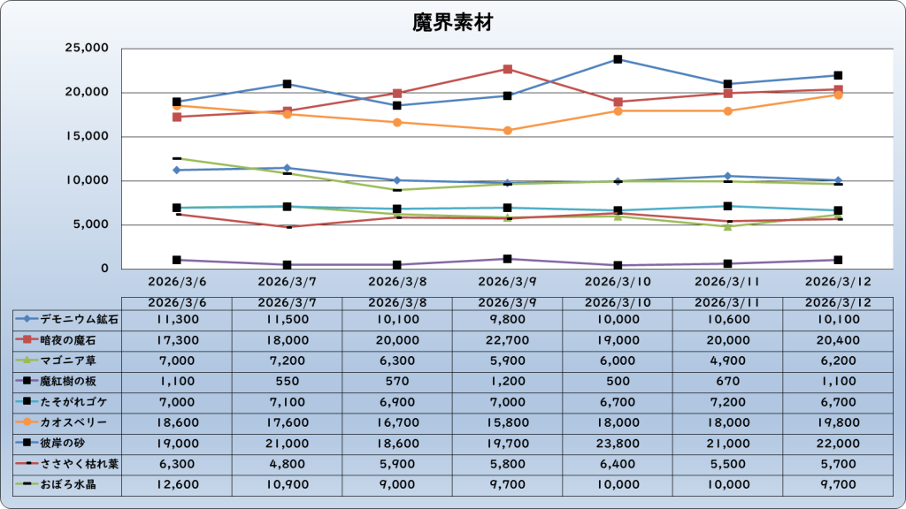 それでは、2026年3月12日までの1週間分のバザー相場の動きを載せています。