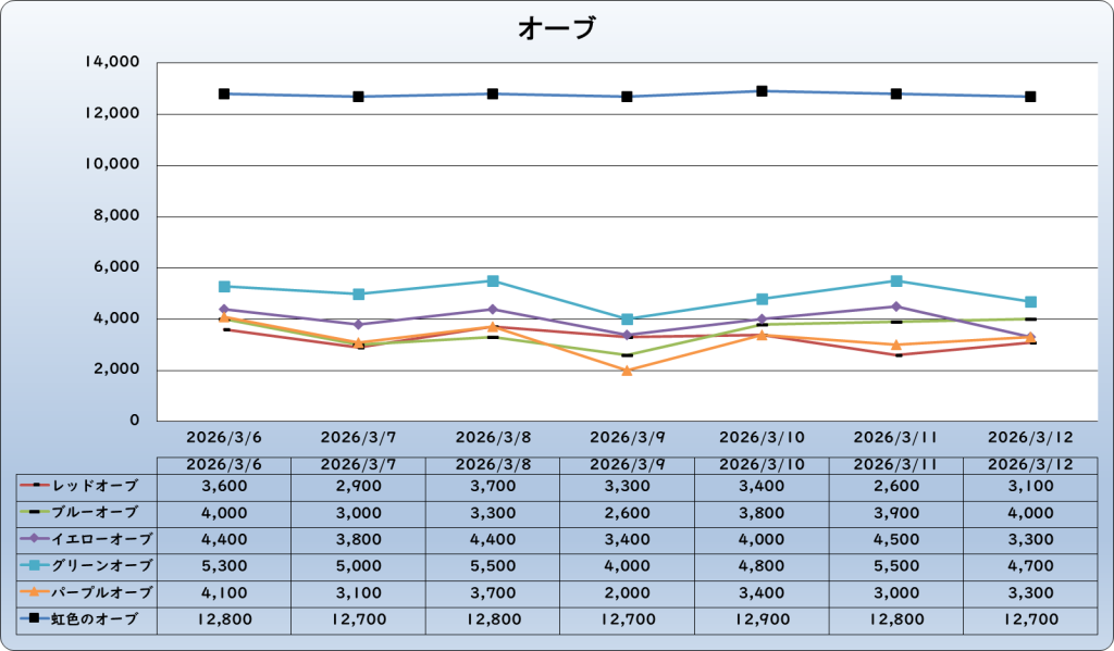 | 虹色のオーブ | 12,700 | -300 | -2.3% | 13,000 |