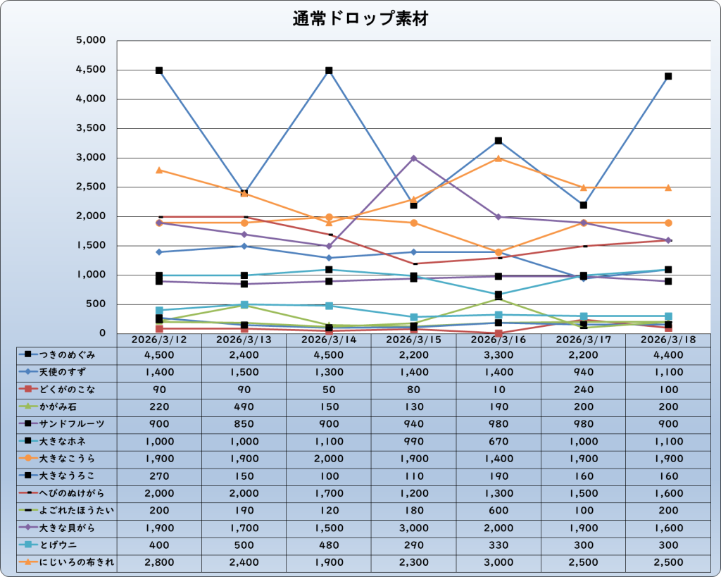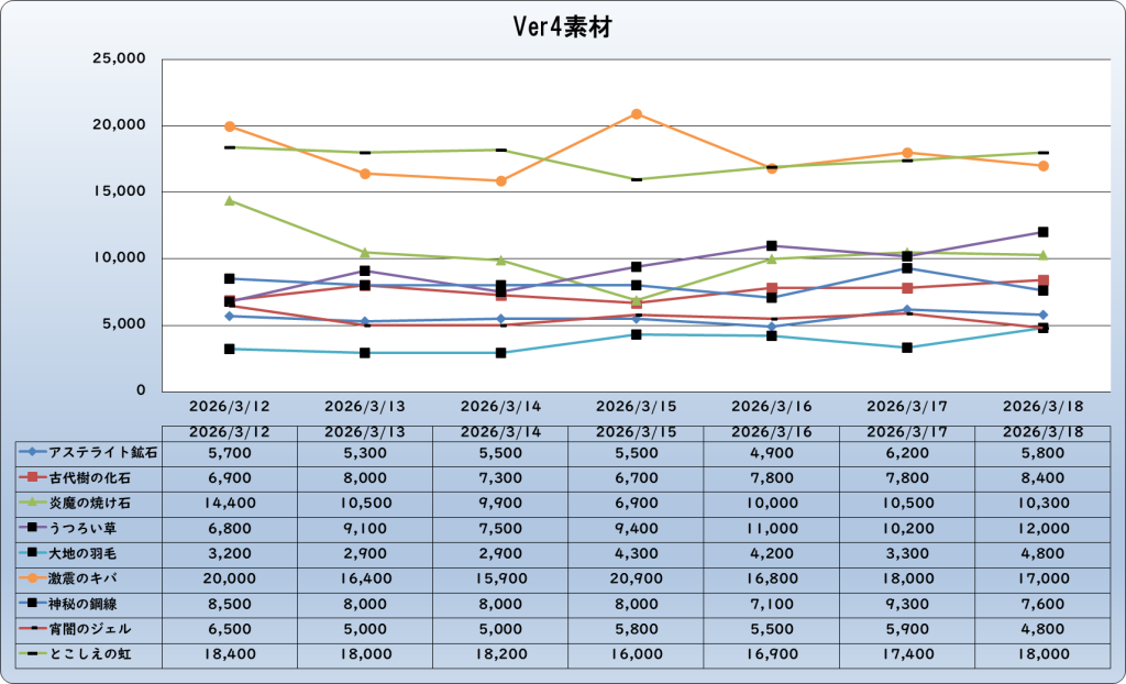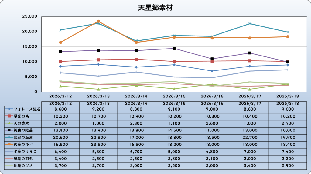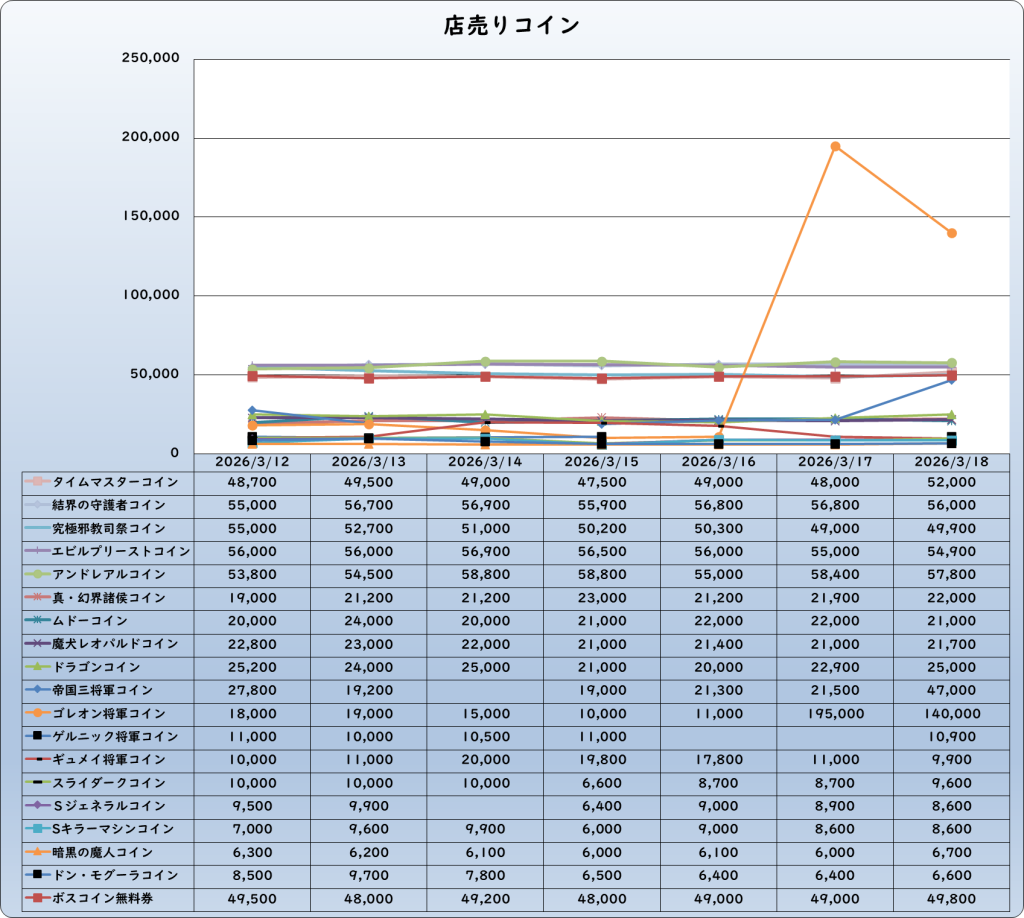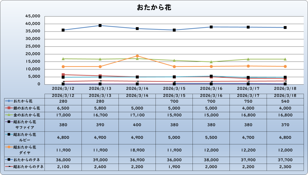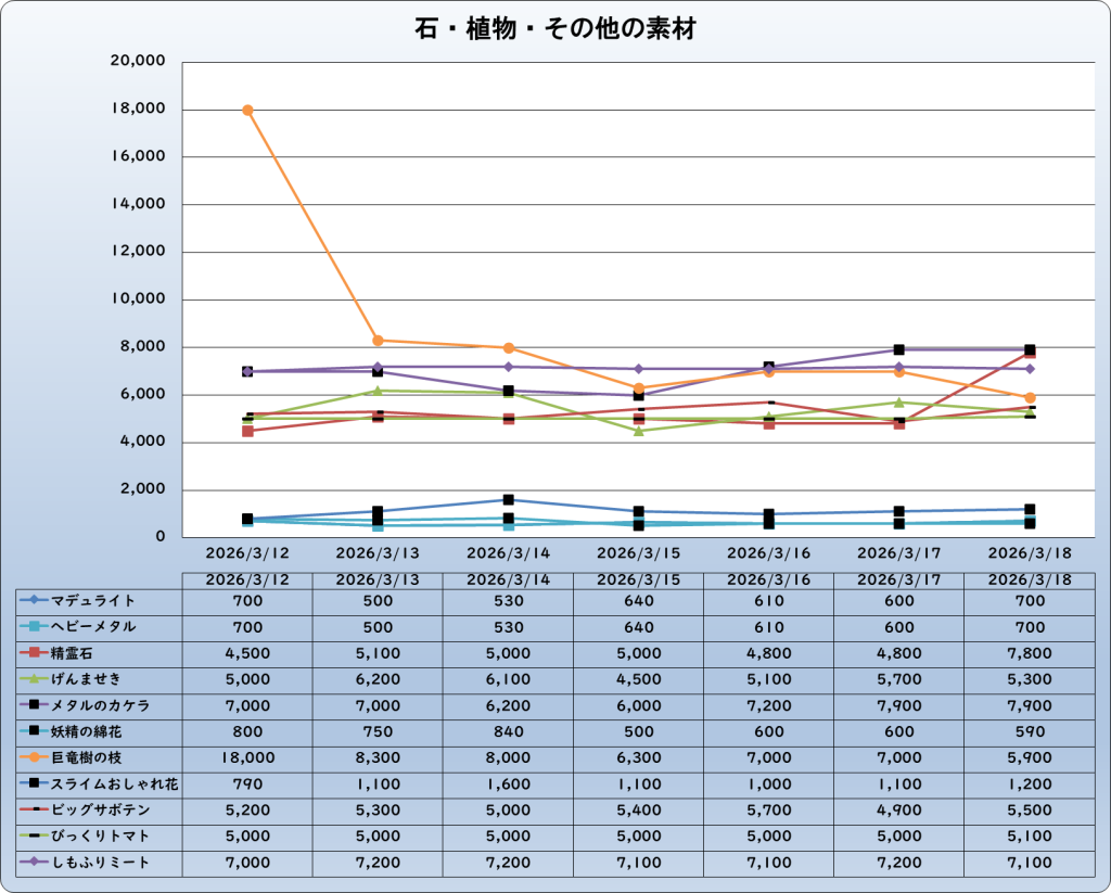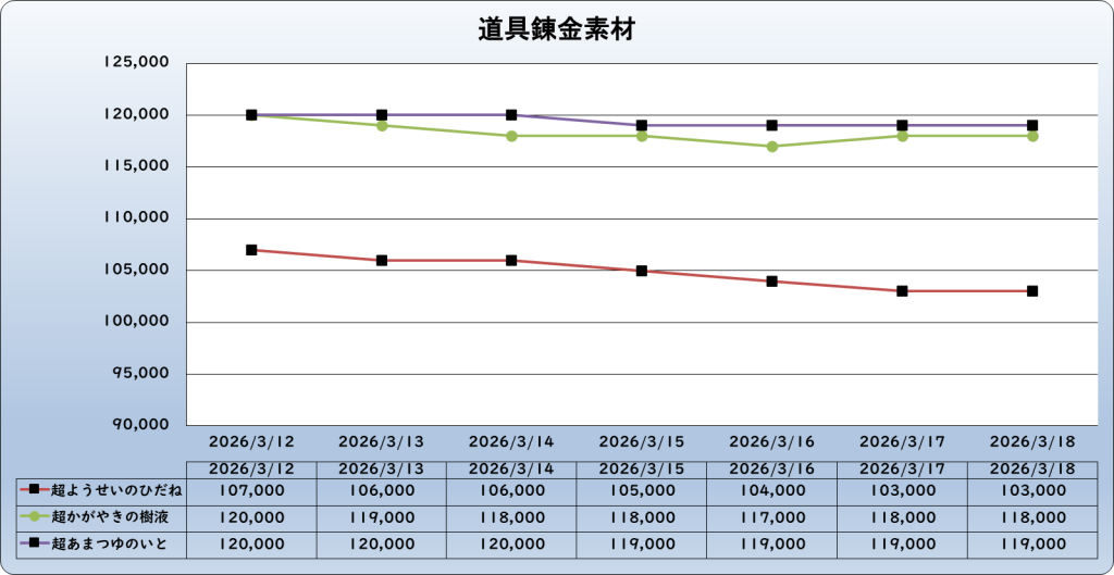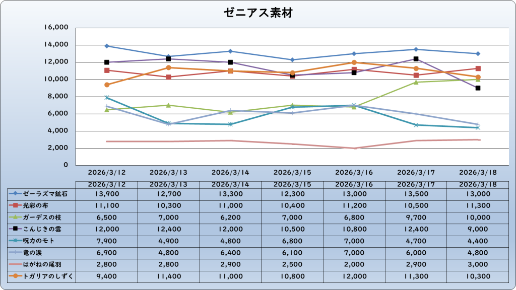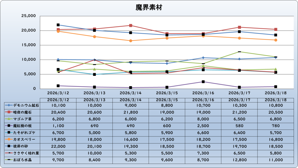 それでは、2026年3月18日までの1週間分のバザー相場の動きを載せています。